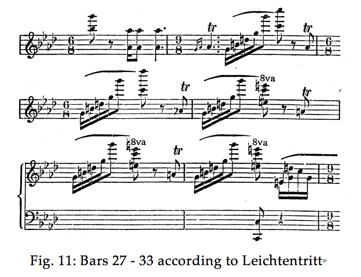 Then, at bar 25, there follows a development that will bring us to C Major, shown schematically in the last system of Fig. 9. It starts with the upbeat of bar 25 as a sequence where the G flat is the surprising element. There is a crescendo mark here, which means it should still be piano. The trills prolong the accent on this double octave into the next bar, and the same is repeated two bars later on the A flat. H. Leichtentritt proposes to move the barline at this point: