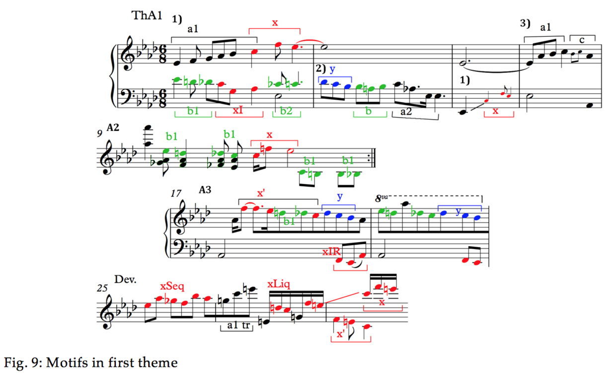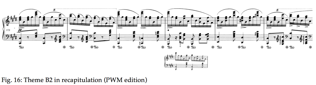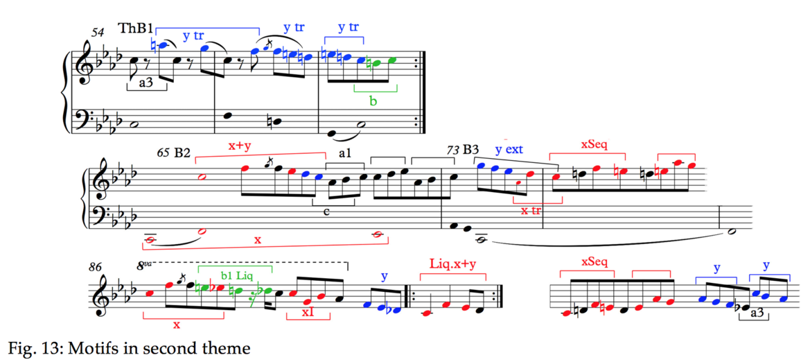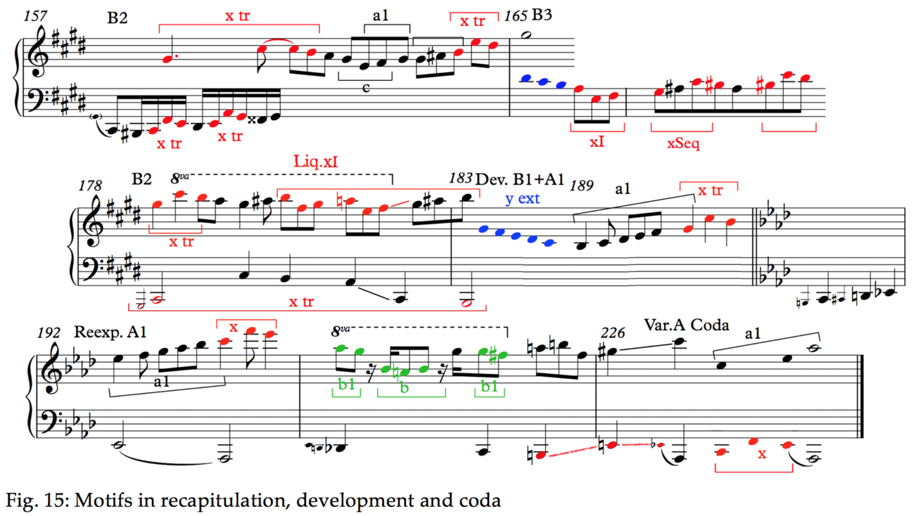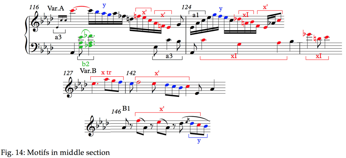 As already seen in Fig. 2, both themes share the descending motion y. In addition, if we consider the statement of theme B in A flat (bar 146), the pitches correspond to those of motif x. These are shown at the far right in Fig. 2. In the original key, the strand B2 combines both x and y in the original pitches (bar 65). The second bar of A1 also contains the rhythmic seed for B1, the iambic swaying. As for the episode, the variant of A at bar 116 uses the pitches of x integrated in the passagework as well as the sixth that serves as appoggiatura. Enough to call it a variant of the first theme [19]. As for the variant of the B-theme, this is clarified in the graph where its parentage from B2 should be obvious.