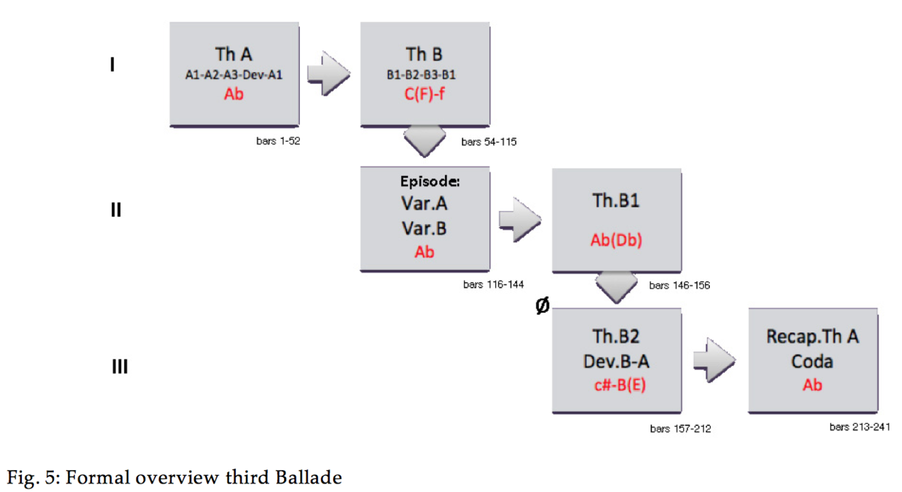 The form of the Third Ballade is certainly derived from the sonata form, but like the three others, it by no means obeys to the prototype of this form as established in the beginning of the 19th century. We have already touched upon the deviations in the first Ballade, and in many respects, the shape here corresponds to that one. But again, Chopin creates a new form emerging from the necessity of the content. The scheme is summarised in Fig. 5: