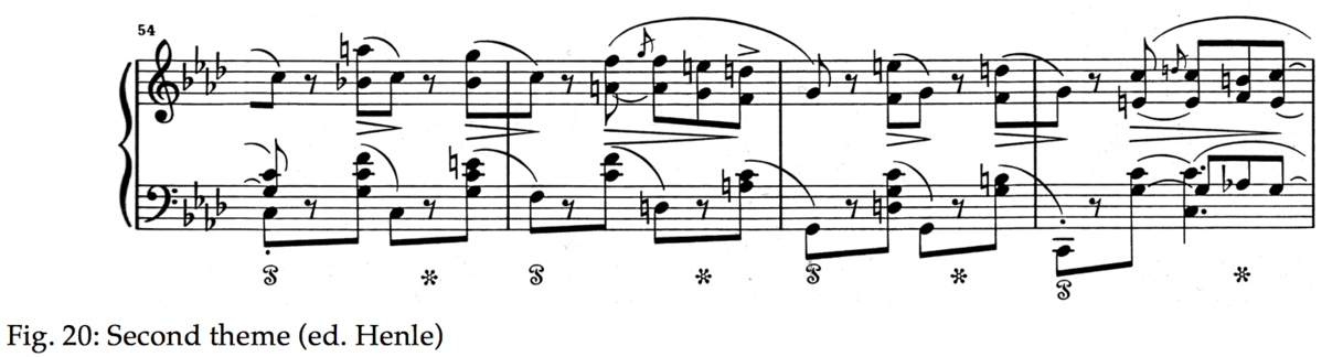When it comes to the phrasing of the first theme (Fig. 4a), I shall return to this when discussing some of the historical recordings. But the correct phrasing, separating the C from F-Eb, doesn’t mean that these three notes don’t hang together motivically. Some scholars consider the F-Eb as being the central motif here [15], and this is plausible, but it does hide some of the connections that I find important in the piece.