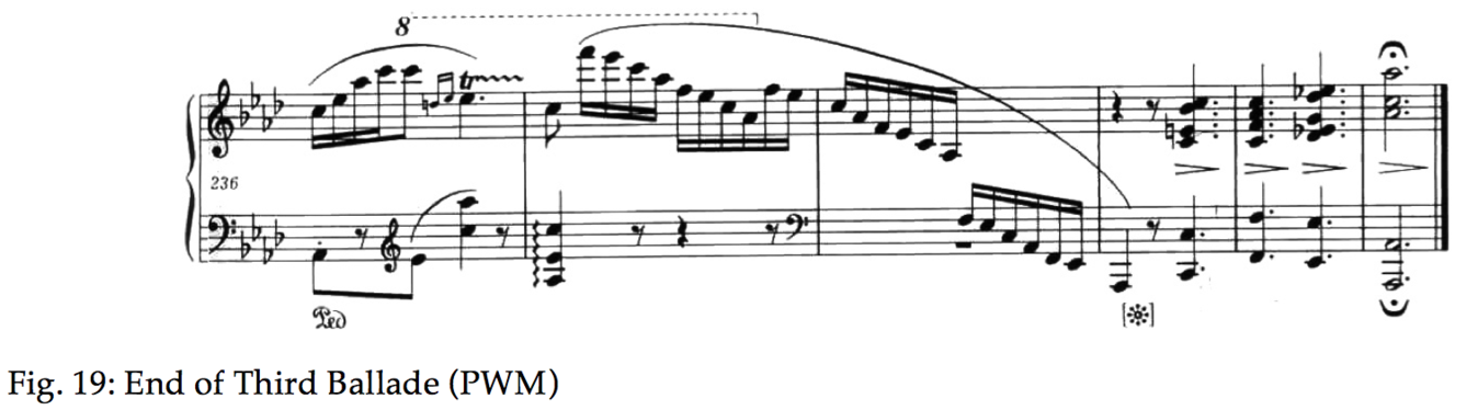 When, some years later, Chopin returns to the Ballade form, it takes a completely new guise. Known as being in the key of F Major, op. 38 ends in A minor, and the duality between these tonalities is really the ‘story’ of the piece. Schumann testified to have heard Chopin play an earlier version that concluded in F Major and called it the “Ballade in F major/A minor” [7]