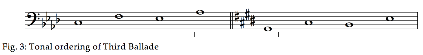 I shall return to the details of this survey, but my purpose here is simply to establish the fact that the motif x is not only responsible for most of the melodic material of the piece, but also determines the disposition of tonalities. The second theme is first heard in F minor, coming out of an unstable C major, then returning to A flat via E flat, although in bar 103 it touches back on C major on the way. The second time, the theme starts in an unstable A flat major (bar 146) to land on C sharp minor (the enharmonic of D flat, the subdominant), then moving to B natural wanting to go to E, which it finally does in bar 226. Fig. 3 shows this sequential ordering of tonalities.