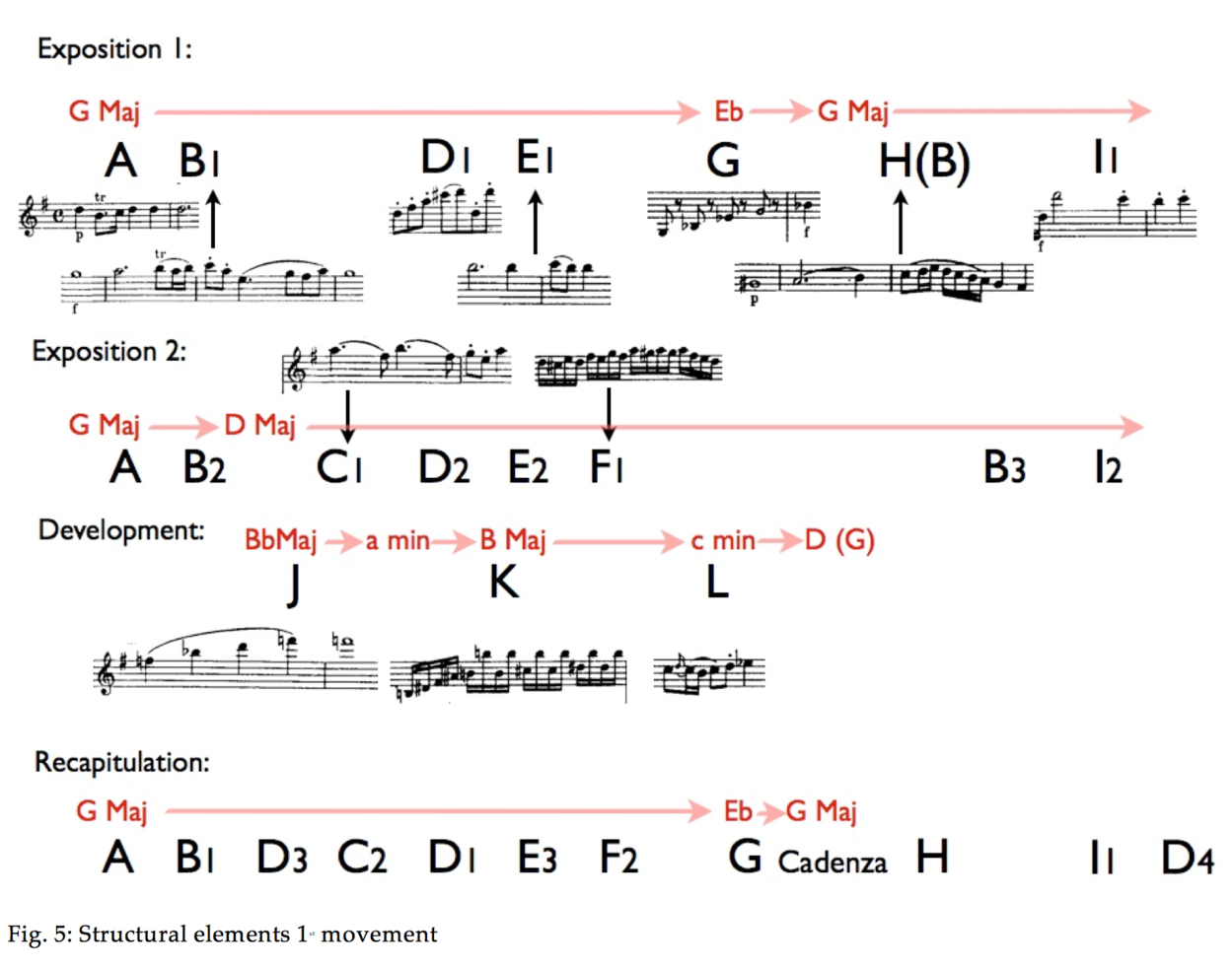 One of Charles Rosen’s main points in his chapter on concertos is that looking at the place of the various themes in the orchestra exposition, the solo exposition and the recapitulation, and determining which ones are on the dominant or the tonic, is more important than putting labels like first and second theme, bridge, etc [4]. To this purpose, I made the following diagram of the first movement (fig. 5):