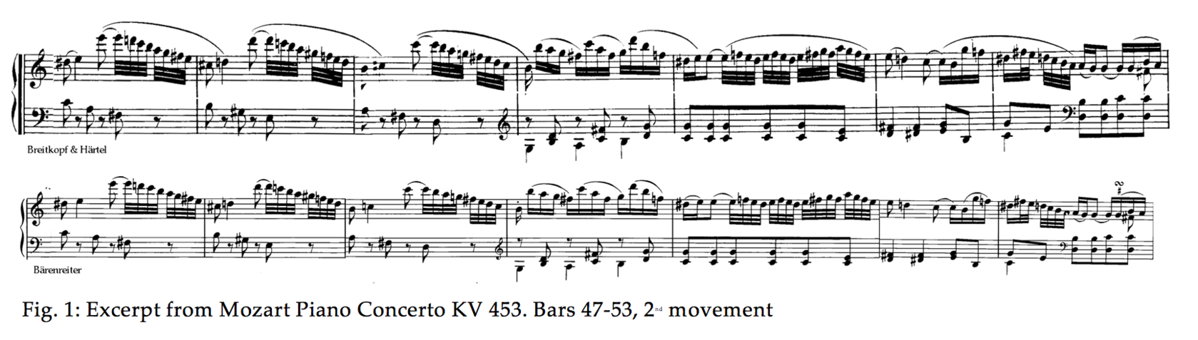 As an example of articulations/bows that reflect serious stylistic misconceptions, Fig. 1 shows two editions of the bars 47 to 53 in the second movement, Andante, of Mozart’s piano concerto KV 453, the work that this essay is about: