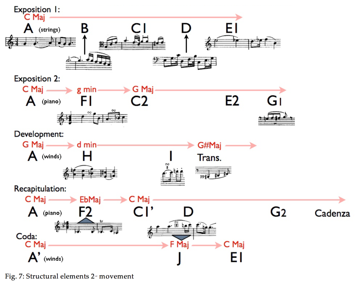 The second movement is, structurewise, quite similar to the first in that we again see a sonata form with double exposition, but here each of the five blocks (the coda is one of them) starts with a recurrence of the main theme, with a different instrumentation each time. Every time, the theme stops dead in the fifth bar, followed by a fermata. This silence that follows, is charged with magical mystery, each time interrupted by a completely different episode, creating an dramatic surprise at every recurrence. The exception is the last statement in the coda, played by the winds. Here, the surprise consists of the modulation to the subdominant and the piano introducing the new theme J, in fact a consequent giving to this last statement a long awaited feeling of closure. The frequent returns of the main theme gives the movement a rondo-like appearance, but it is clearly a concerto-sonata form. Fig. 7 shows the outline. I have used a slightly different chronology for the names here: the various episodes get new names rather than B1, B2 etc. In fact, B never returns.