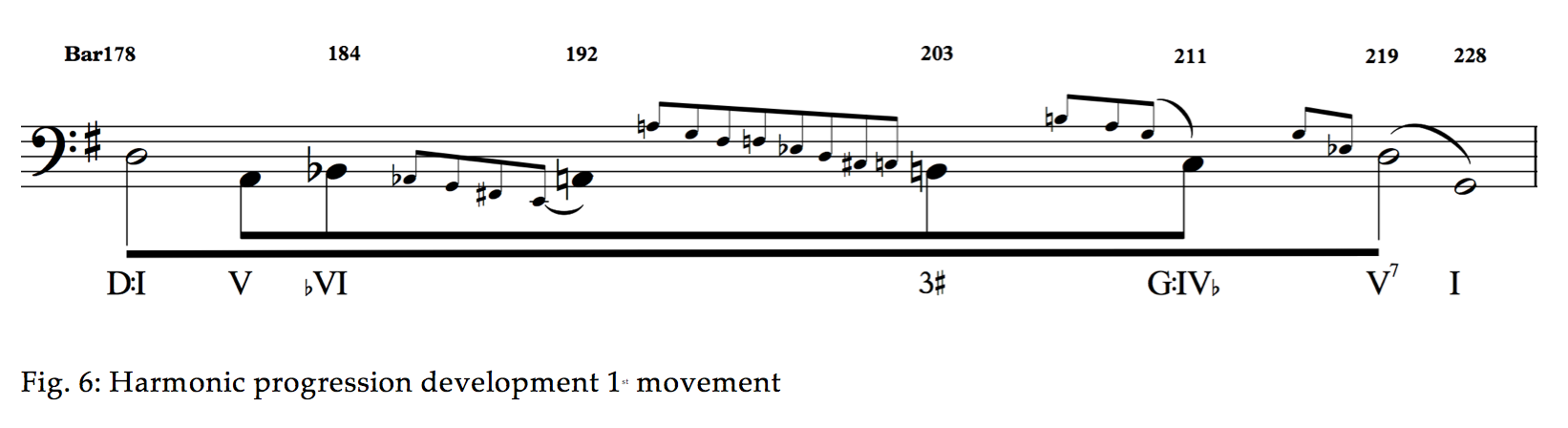 Another feature here is the sudden change to E flat with theme G in the orchestra exposition. This Trugschluss is reflected in the development, where the A (dominant of D) goes to B flat in a similar V - bVI progression. Here the winds introduce the theme I, apparently new, in fact a variant of theme G. What now follows is extraordinary: via A minor we ascend to B Major (K), then via an ingenious modulatory trick in bars 207-210, to c minor with the theme L. The whole progression is shown in the graph of fig.6, starting from the D Major closure of the exposition.