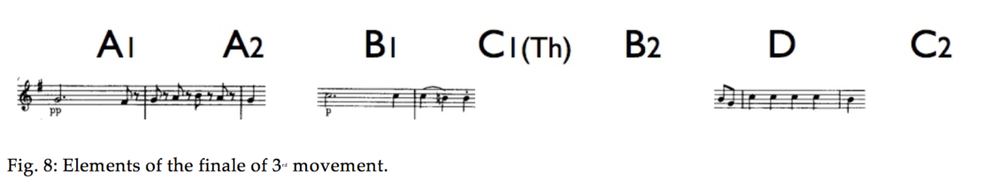 The third movement has a much simpler form: it is a set of variations, not very common in Mozart concerti (the C minor concerto is another example). There is acceleratation of note values from one variation to the next, except in the 4th variation, which is in the minor key and with syncopations, which provide increased tension. After the joyful fifth variation we get a true opera buffa finale, where we may very well imagine the various characters on stage commenting on each other. The main elements are shown in Fig. 8.