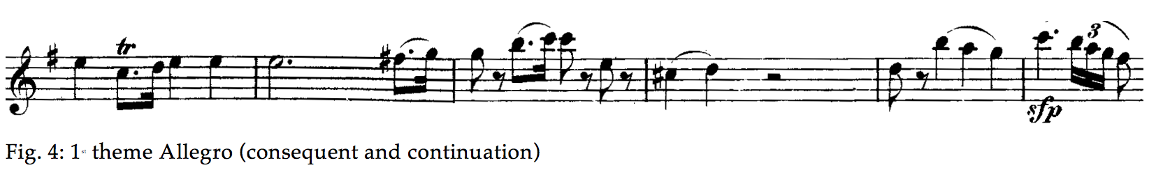 In the opening of the first movement, the question is whether stress should be put on the high B or on the F-E of bar 4. I would say the last, since it is an arrival point, but one can still put into value the ambitus of the phrase. The consequent here also descends back to D but after having extended the ambitus to the C above. The relation between this C and the B is further exploited in the next phrase (fig. 4):