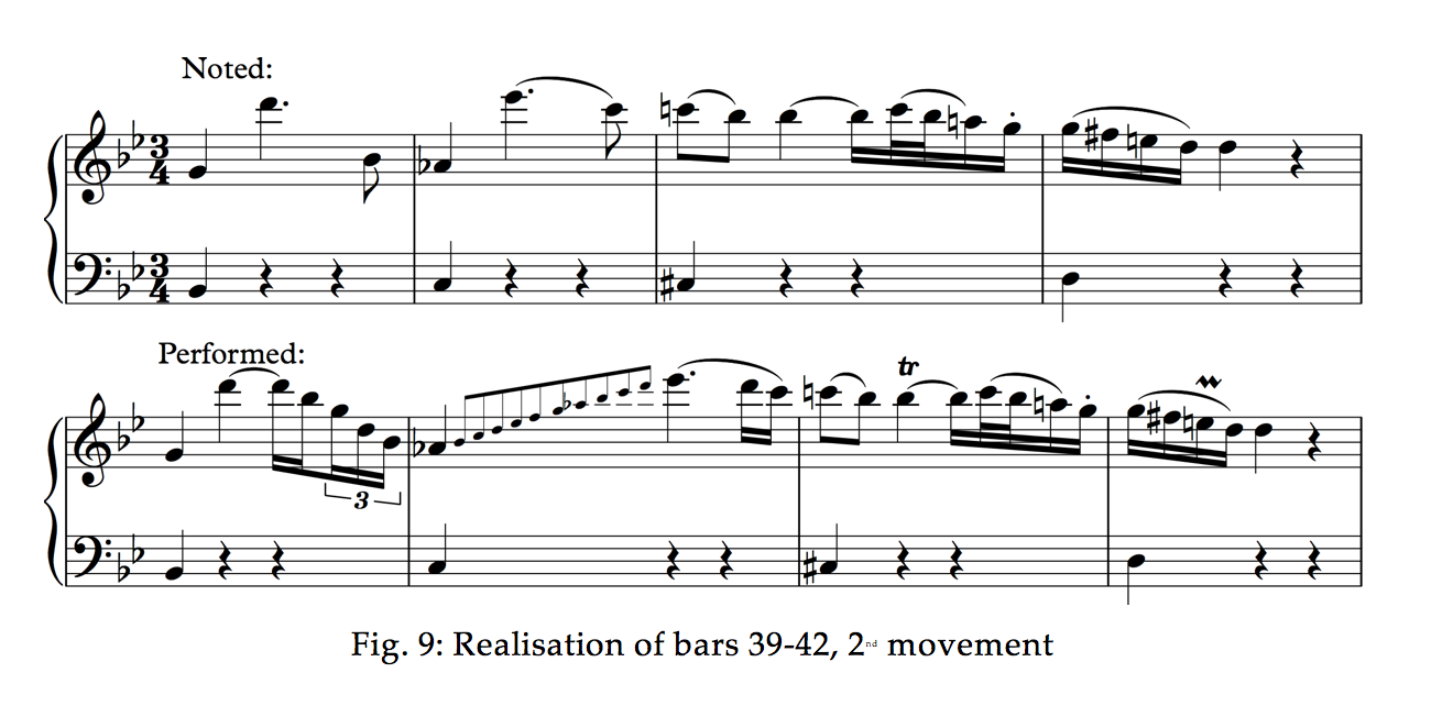 There is also ornamentation to be added to some long notes in the slow movement. This is particularly the case at bar 39 which I show in Fig. 9, with my realisation in performance: