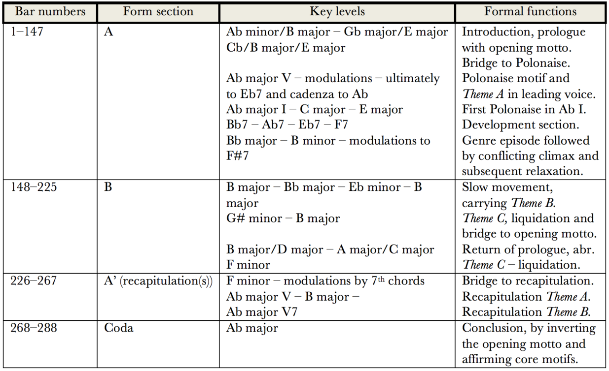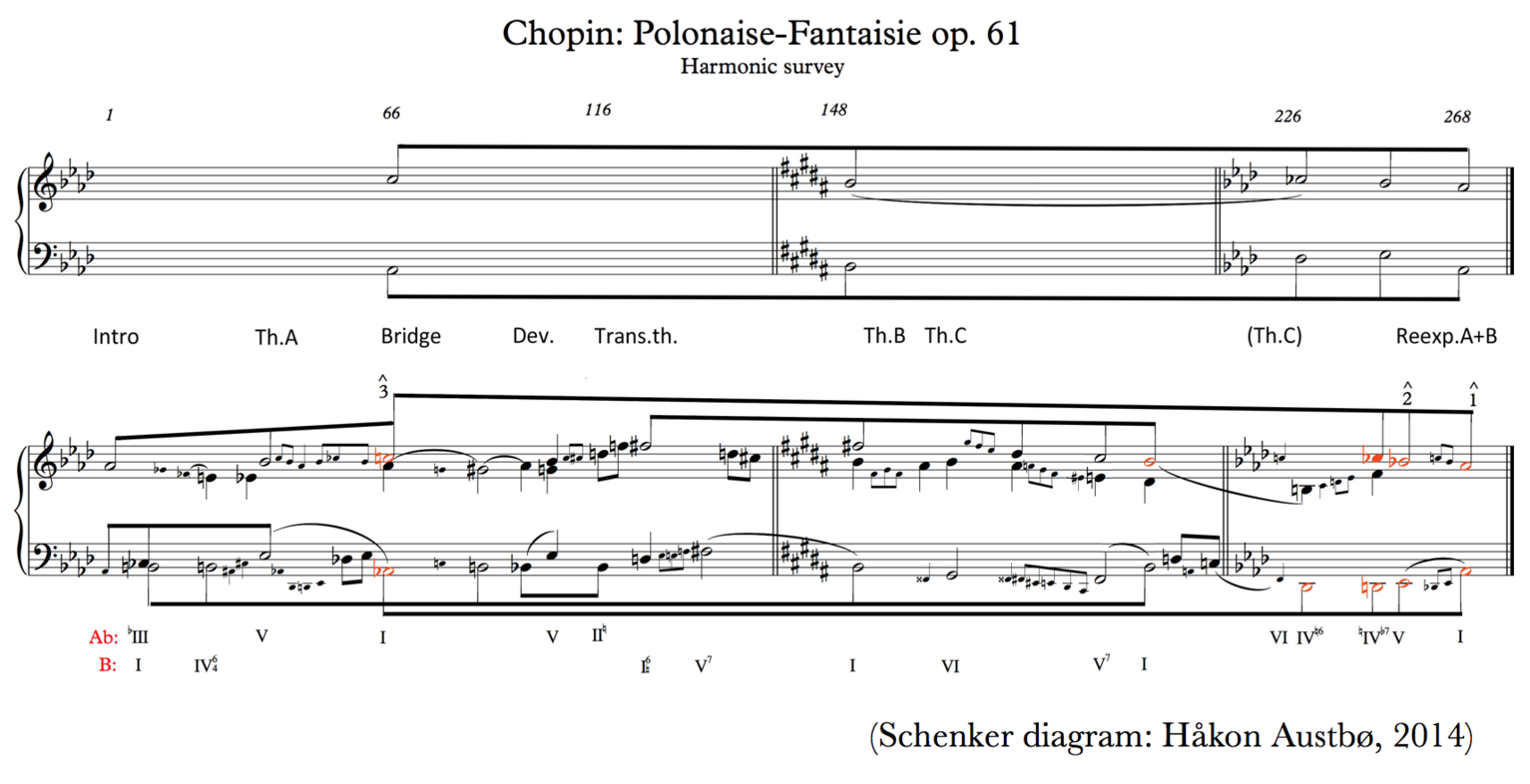 By his own way of performing (dealt with more exhaustively below), Chopin guides us to certain priorities. Quite a few point to, or converge in, rhetorics of form and the imperative of coherence. This might be acutely useful for our encounters with the Polonaise-Fantaisie. Its rhetorics also encompasses articulation of form, the establishing (in tonal music) of a relief in sound where the harmonic strategies become audible, and then about explicating the actual and specific structural levels locally, not least by stratifying them. For op. 61, the harmonic strategies may be clarified in this manner: