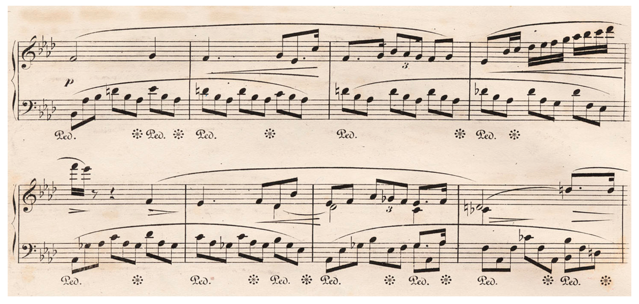 Regarding Chopin [5] I understand – or launch – the concept of ‘late style’ to encapsulate both certain characteristics of a group of works, as well as a certain compositional practice, that is: way of composing, a method. As with several other (at least significantly original) composers of the 19th century, one may trace the very Romantic split inwardly in their production, the one coined by Raphael Georg Kiesewetter already in 1834 as the «Rossini and Beethoven style», respectively. [6] That is: one designated and directed towards a performance, the stage, and the other associated with the motivic and developmental work prototypically inherent in pieces by Beethoven. Scores of the first category are merely sketches for the performer, a manual for a stage presentation; in the second the scores are tantamount to philosophical documents subject to exegesis as texts. [7] Although the Mazurkas are inextricably tied to an oral tradition of the rural Poland, the «Rossini style» with Chopin simply, and perhaps as expected, manifests itself more unambiguously in operatically influenced pieces, not least imprinted by Italian opera’s la grande melodia as well as its rubati, improvisations and embellishments. As we know, Chopin did not encounter Italian opera and mastersingers only after his arrival in Paris, although he famously attended (as far as he had a chance to) every opera premiere in the Romantic capitol. Anything but a musical province, he could already from childhood on hear most of them in the city of Warsaw. For the rest of his life he kept track of all the great singers of the time, the Italian virtuosi, and enjoyed to share, or maybe even display, his detailed, precise and exact knowledge and judgement about their splendours as well as flaws. Supreme examples of «Rossini style» or off-springs of a such with Chopin, especially in the fashion of the contemporary elegant and light bel canto, are of course the Nocturnes, but even more clearly and unveiled in the early larger works, before his emigration, as in both of the concerti and the virtuoso cantilena style pieces. On the other hand, he constricts himself from implementing more typically operatic staging and role acting in his works, as we find them in Liszt, e.g. in his piano concerti. Liszt’s E flat major concerto is little less than a concise opera with a muted libretto.
