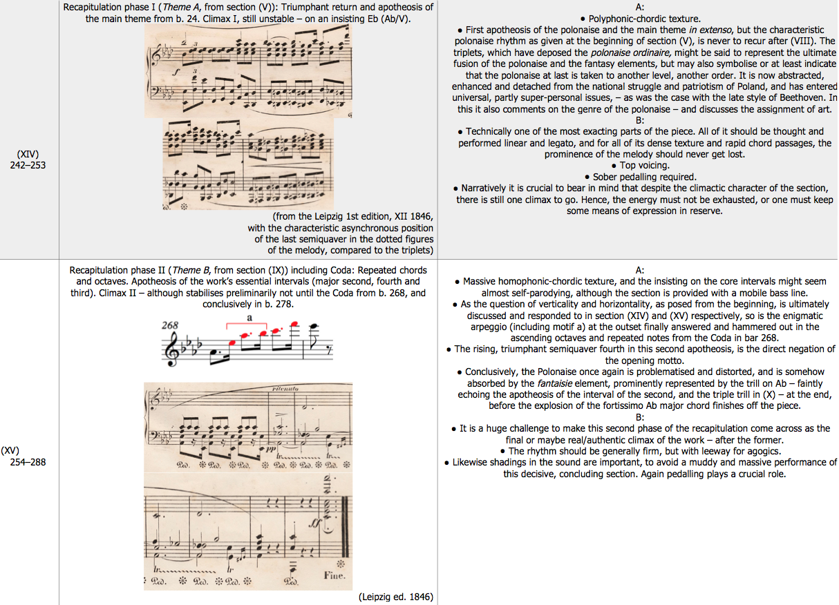 Upon combining some of the knowledges, we may tentatively embark on more compound and semantic interpretations of certain fields. E.g.: When we arrive at the vortex figures drawing and sucking us into the recapitulation(s), we are encountered by an unambiguous virtuoso style. Something that primarily generates energy of velocity, is extremely (here:) pianistically idiomatic and pays off by sounding more difficult than it is. The figures are sequential and rhythmically homogenous. We may in fact in Adornian terms talk of a Durchbruch of the simple, or the flashy – or even populistic. Which is not to say that the piece has become sloppy on the formal and structural level. But all of a sudden it is as if the work, at least for a moment, gives in. The Polonaise-Fantaisie’s prominent and defying resistance to everything that is easy come and easy go – maybe its very hallmark – here seemingly fades away, quite easily. The piece is on leave – from itself, as it were (the change is physically very tangible, experienced as something you slide into, a downhill, or something of a slippery slope). But it is also a definite Durchbruch of the heroic, depicting a summoning of forces before the defining battle. And heroism is never devoid of a populistic element. The ‘message’ must be characterised as straightforward and easily perceived – presented simply and effectively as in a movie soundtrack. The main musical argument comes with the Polonaise motif (for the last time). The motif, but also the dramaturgical situation, is where the heroic is embedded, structurally manifest and texturally underpinned, by its decisive and penetrative rhythm, and by the very contrast and contour of the titanic, bold and clear Polonaise fanfare rising above and through the maelstrom, showing the way out of turmoil and chaos. It predicts and foreshadows the two main themes, ferociously intensified in the recapitulation’s double apotheosis (by the way, possibly the work’s only flaw). From the structural elements we may extract the following initial meaning: the descending minor second in the bass, from the minor sixth to the fifth, is a disturbing signal that something is afoot, but then it falls even through the floor, to the second below («this is serious, this is for real; we’ve reached the point of no return»). And exactly on that spot, where the ground is yielding, a rope, a lifeline is thrown out; and of course, that new rescuing, redeeming, sovereign, somewhat super-personal element, is the Polonaise motif. — But how this is solved performatively and rhetorically, is by no means self-evident. The performer has the choice of prioritising between a number of textural elements; as the upper treble voice; the bass line; the semiquaver triplets; and of course, the Polonaise rhythmical motif. Further on, this bridge section to the recapitulation both consists of clearly defined materials and is divided into easily recognisable sub-fields. According to both performance practice and individual choices, the paragraphs (sub-fields) and how they are related will probably come across widely different. For instance, in a Romantic performance style, the clear-cut form sections are evaded, [52] and a pianist situated in this will be likely to understate the differences or contrasts between the fields, and rather rule out or make smooth e.g. the sudden shift from semiquaver triplets to semiquavers at the end of the main section.