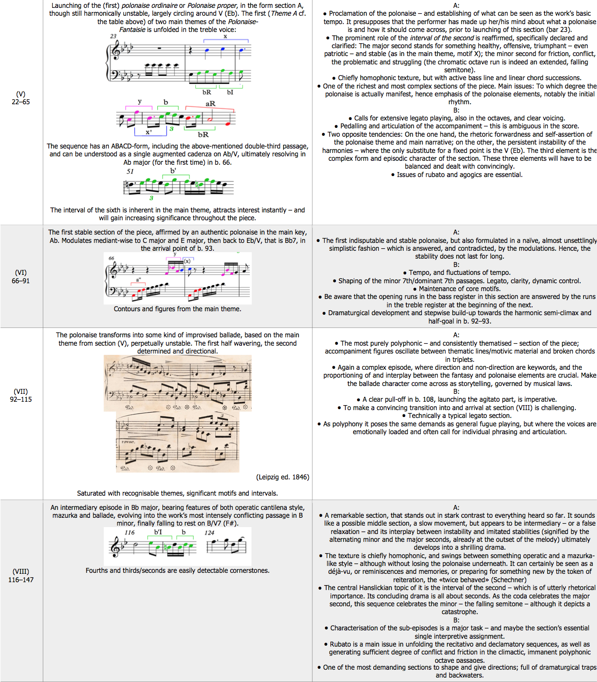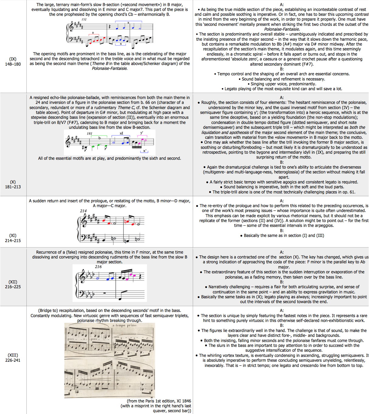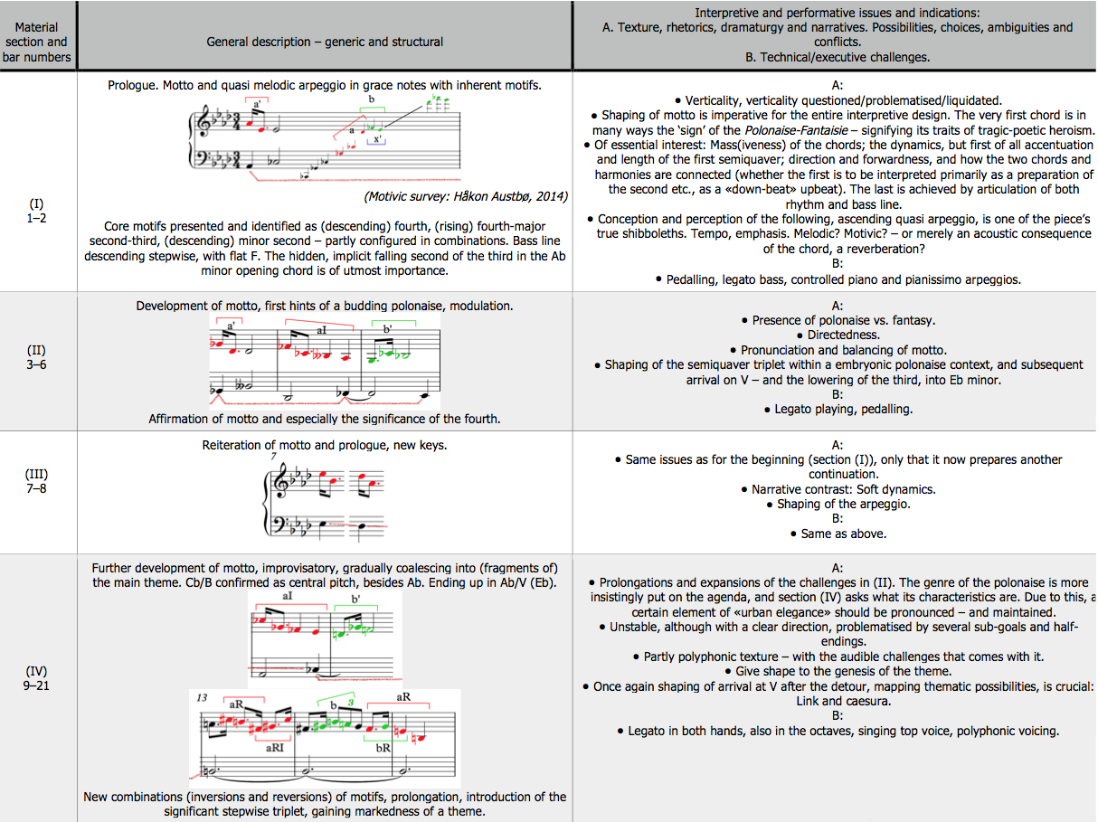 A more detailed array of the entire Polonaise-Fantaisie, where each material (NB: not to be confused with form sections) of it is treated individually, may go as follows – in the disposition of a table: