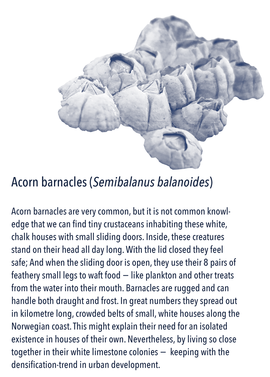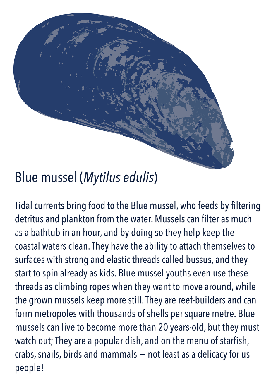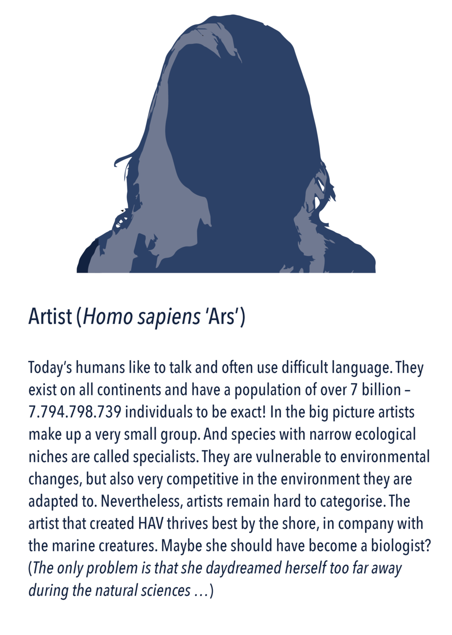 In HAV you meet the co-creators: in a play with the classification system of living things, each is introduced with a profile picture and name. This system has seven levels: kingdom, phylum, classes, order, families, genus, and species. Organisms are commonly described by the two-term naming set-up of genus and species — like the blue mussel’s name Mytilus edulis. In Latin mytilus means a sea