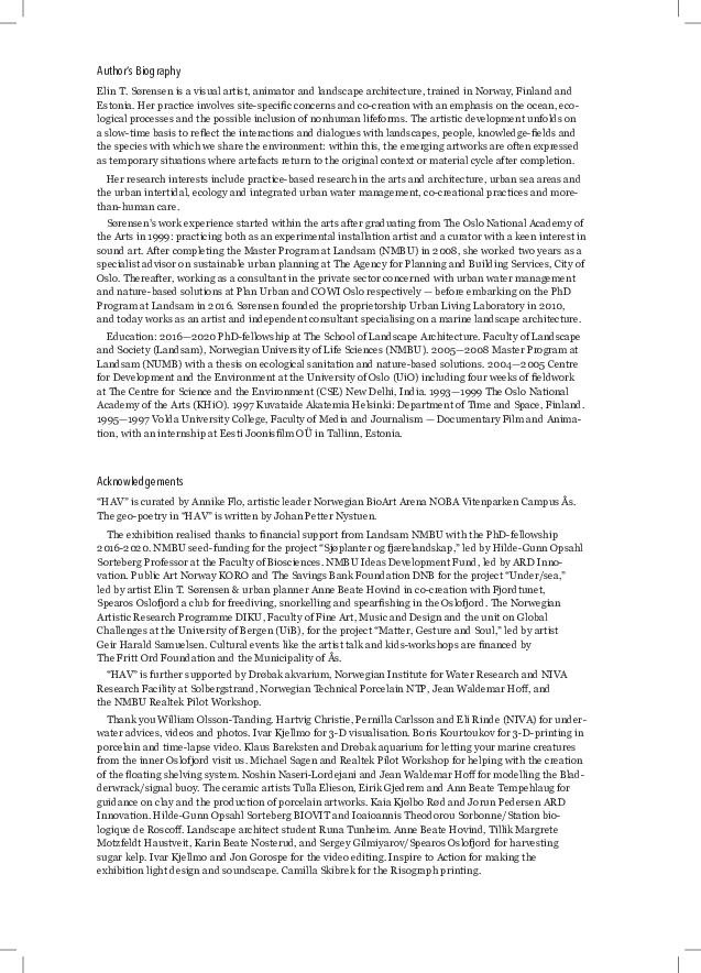 HAV evokes the spatiality of the undersea landscape together with the colours and lifeforms within this hidden, fluid realm. HAV has many co-creators: barnacles and marine biologists, porcelain, sugar kelp, saltwater, ceramicists, crabs, clay, annelids and many more. HAV was orchestrated by artist and landscape architect Elin T. Sørensen as part of her doctoral project “Multispecies Neighborhoods in Urban Sea Areas,” the Norwegian University of Life Sciences, NMBU. Curated by Annike Flo and staged at the Norwegian BioArt Arena NOBA Vitenparken Campus Ås 2020. Image: Barnacle (Semibalanus balanoides). Scanning electron microscope (SEM) micrograph acquired at the Imaging Centre NMBU by Lene Cecilie Hermansen with Zeiss EVO50 EP. Sørensen © BONO 2020.