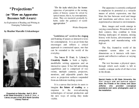 This project explores how scholarly technique is shaped by the technologies used to produce it by documenting the growth and development of a long-term scholarly interest through multiple iterations culminating in a digital artistic installation presented using the Creativity Studios of North Carolina State University’s James B. Hunt, Jr. Library as part of the 2014 North Carolina Literary Festival whose topic was “The Future of Reading.” The installation was entitled, Projections: Exploring Reading and Writing in Emerging Technologies (or How an Apparatus Becomes Self-Aware). In the essay that follows and in the descriptive work amended via the toolbar above, I reflect on the role of the scholar as producer, creating and expanding the applications of emerging technologies of writing.