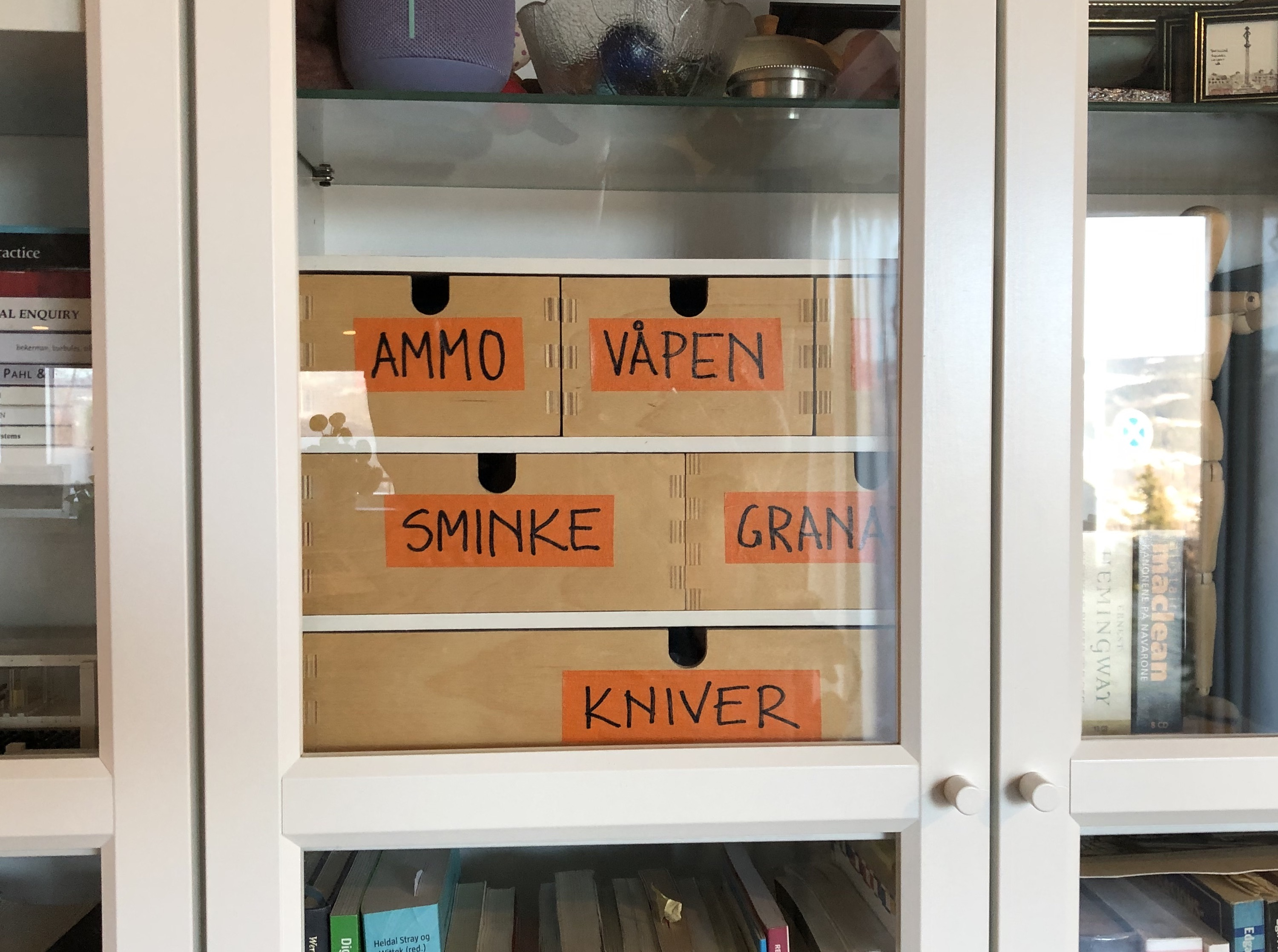 I even find the time to have some fun with my wife that gets some highly suspicious nametags on her behind-the-webcam drawers, and I also create a sign we can use to signal each other during meetings.