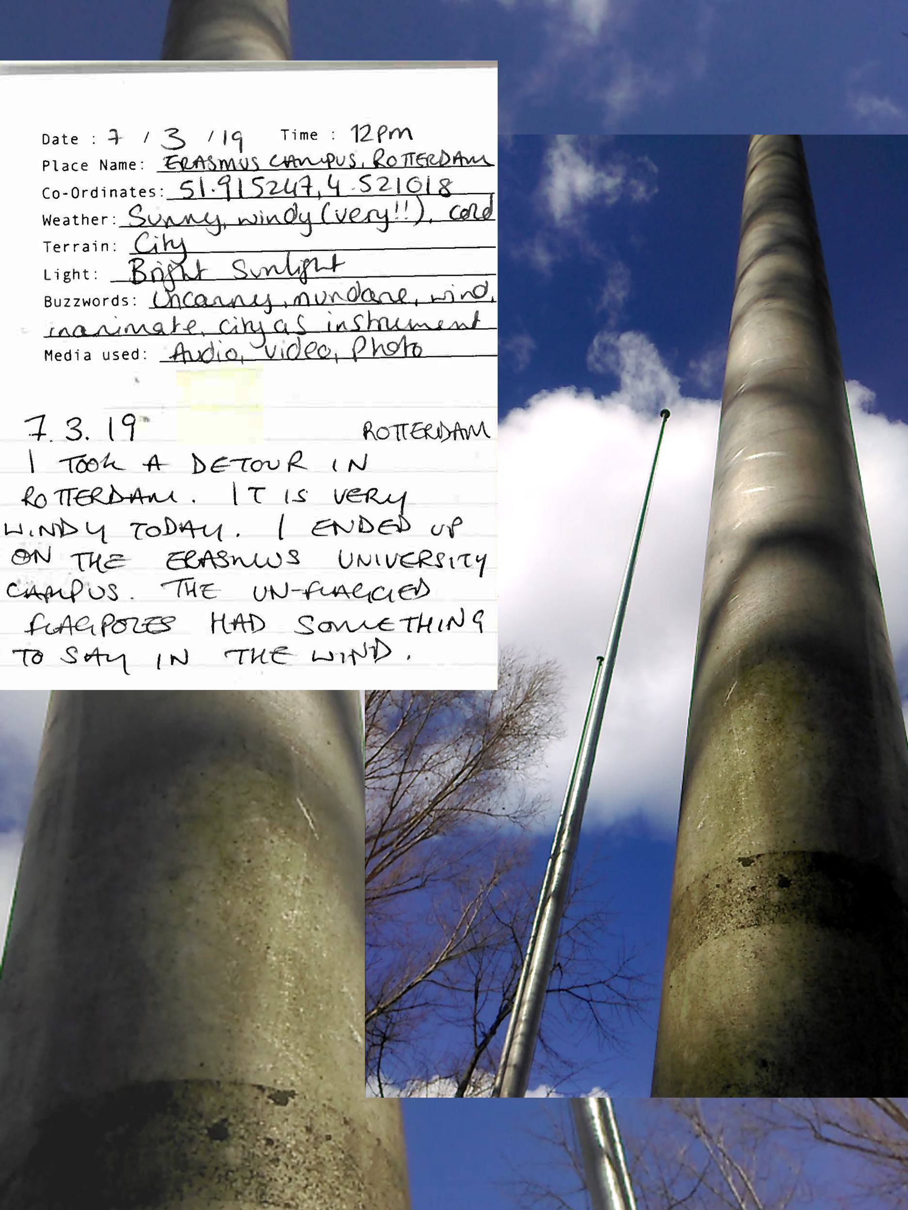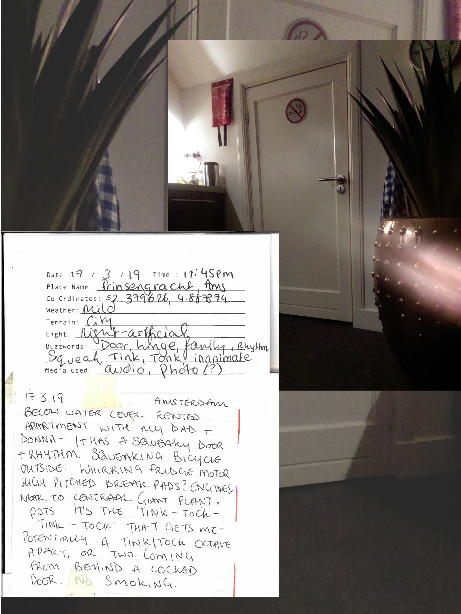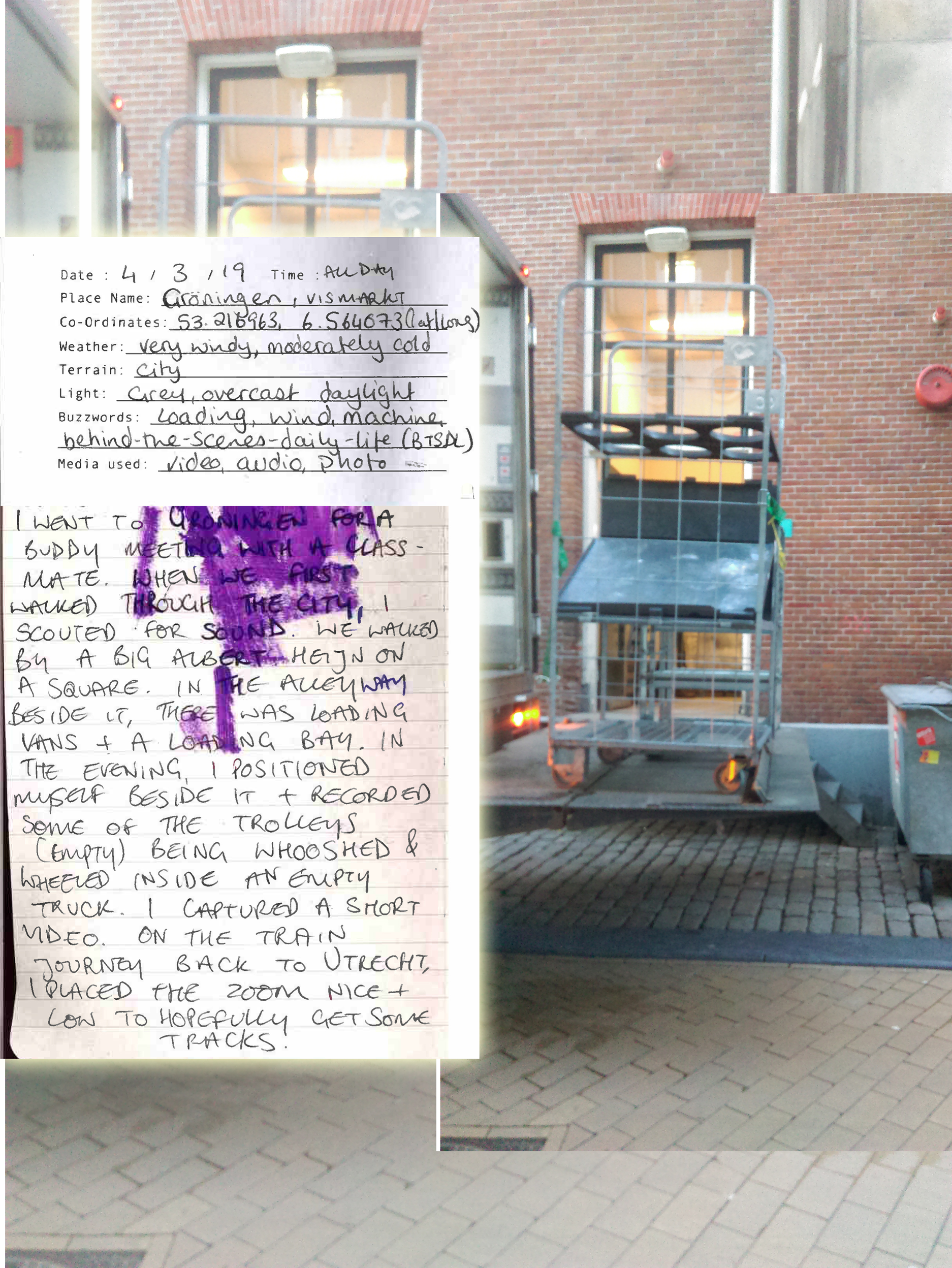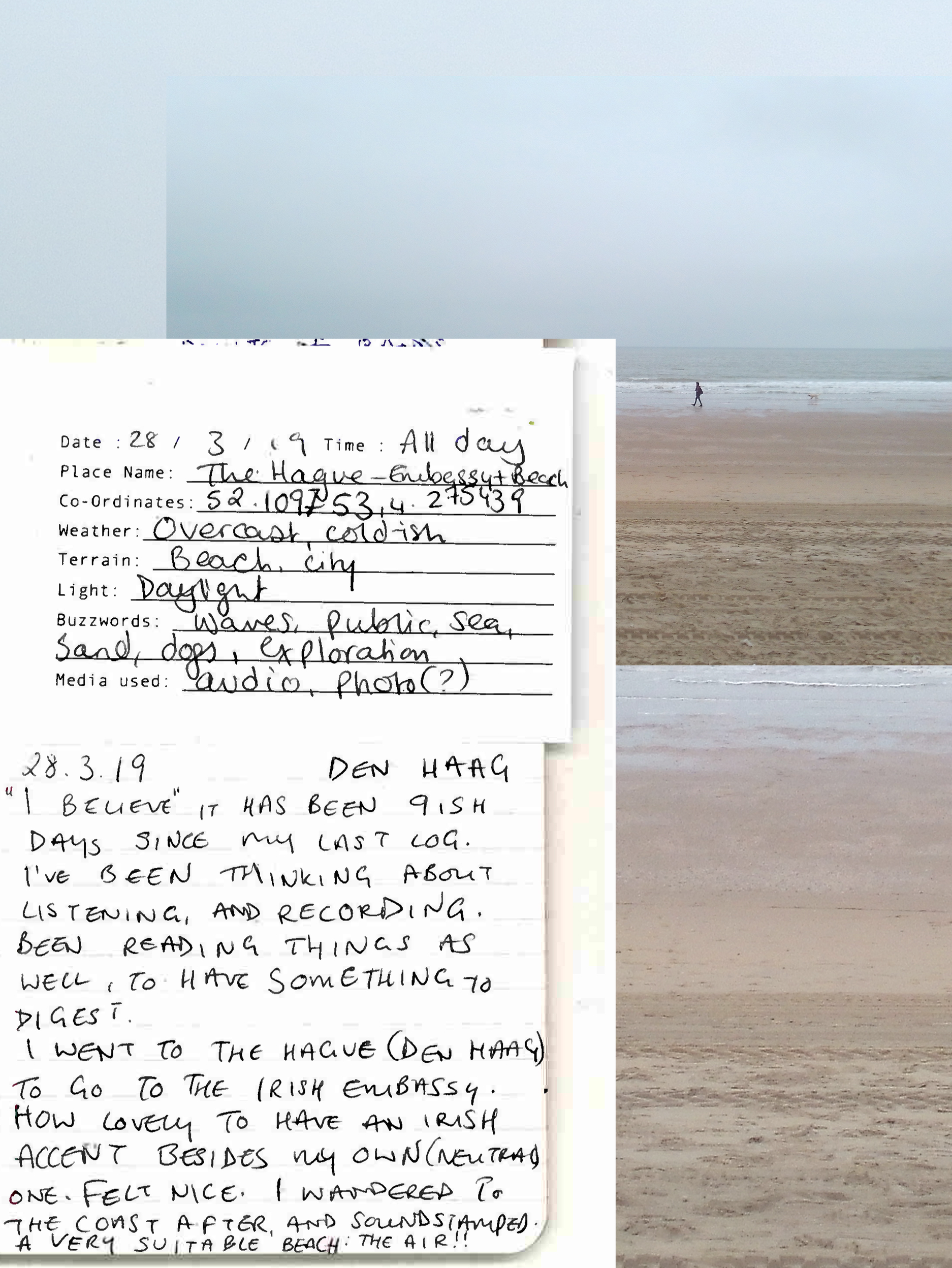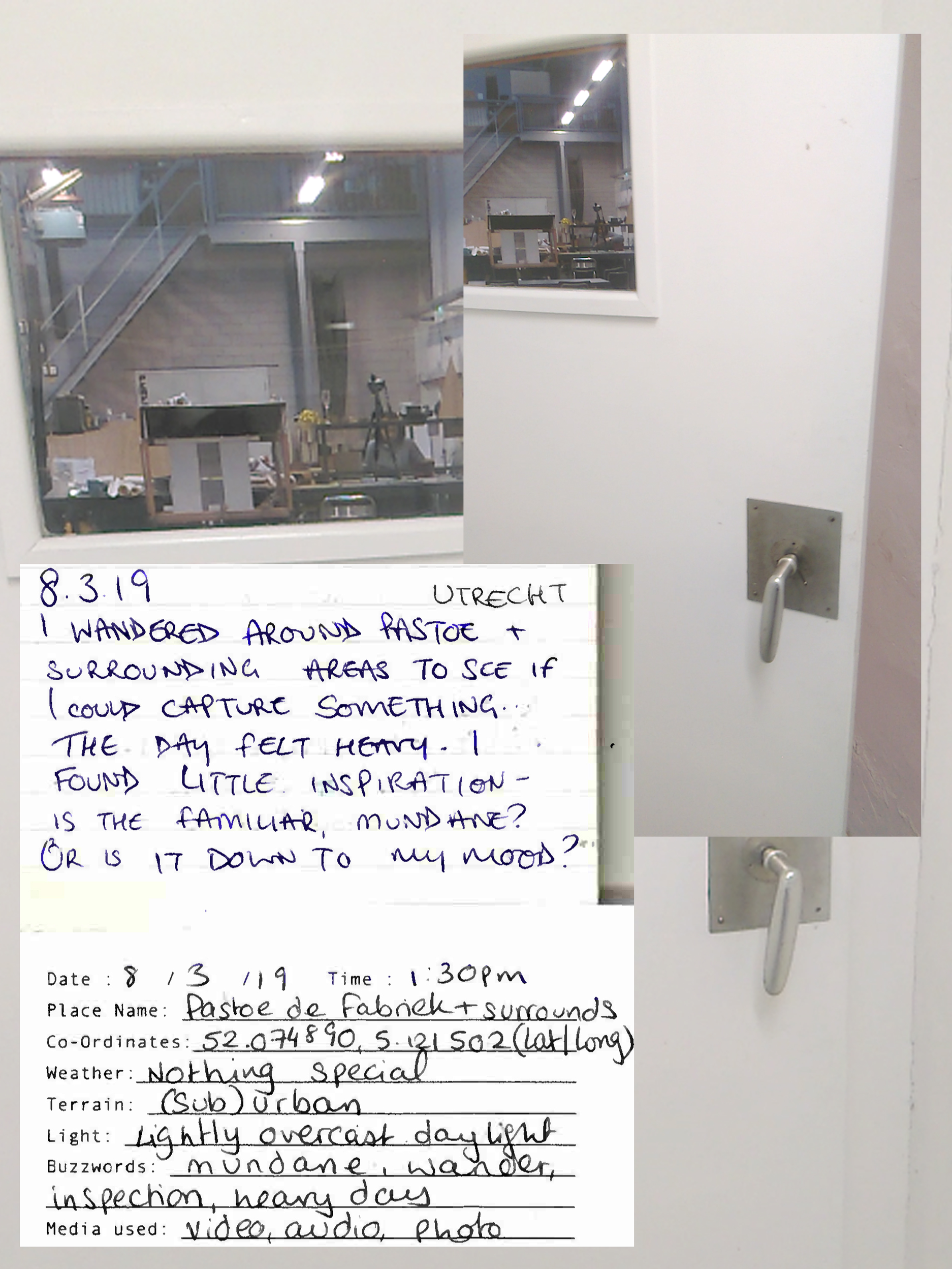 By the mode of 'sampling', I am documenting moments that evoke certain feelings in a space or situation: as though to extract the feeling from a space and time. The sampling forms these Audio Journals - recorded audio clips, with accompanying written log and photo or video. I am seeking something worth paying attention to in the periphery of typical experiences. It is to perhaps eventually form a particular style or aesthetic in my works, or work as Scenographic Foley to create works from, like a painter would have different colours of paint. It is to affiliate with the raw-ness of my surroundings to find something to play with. As written by Dewey: