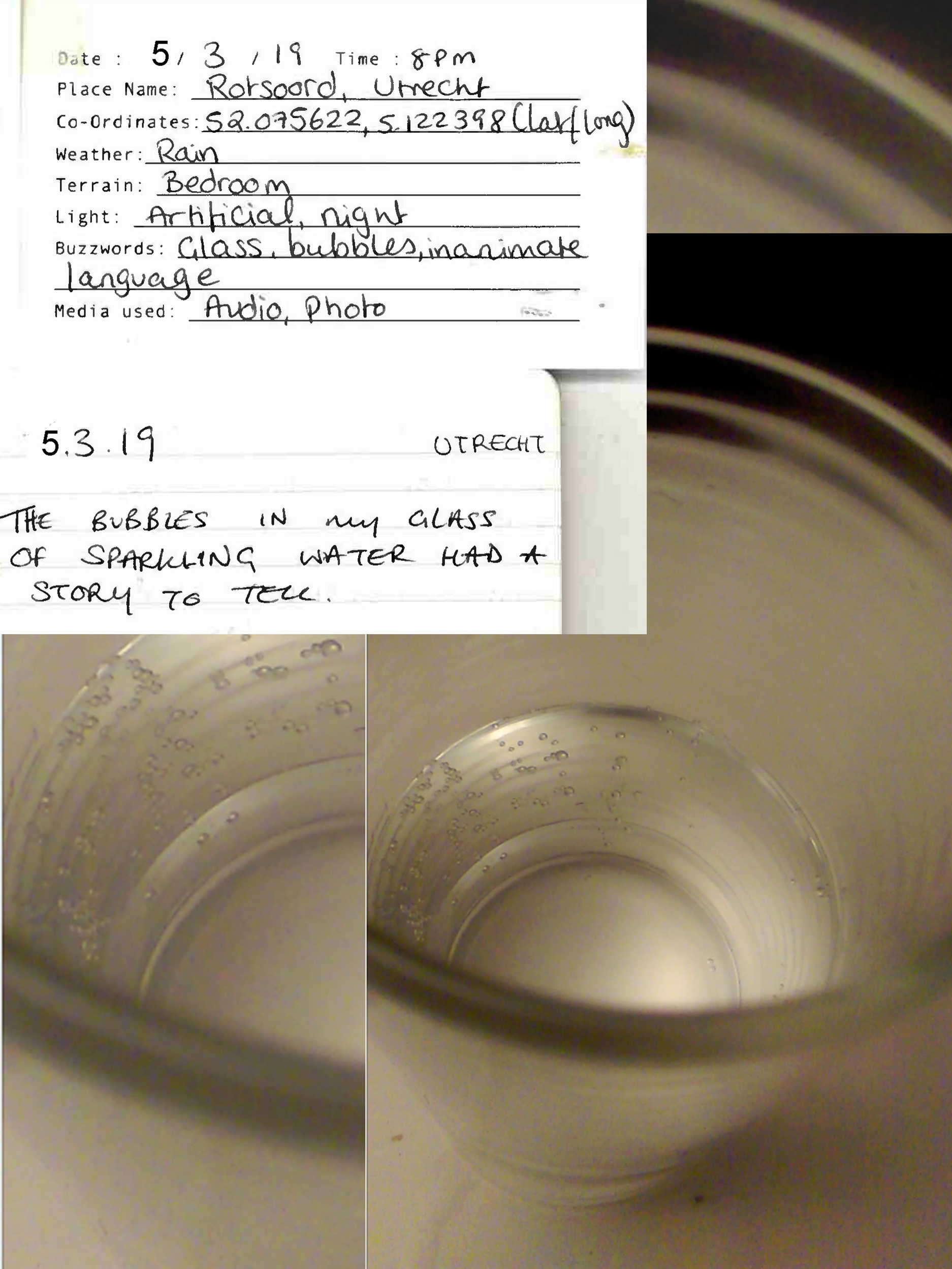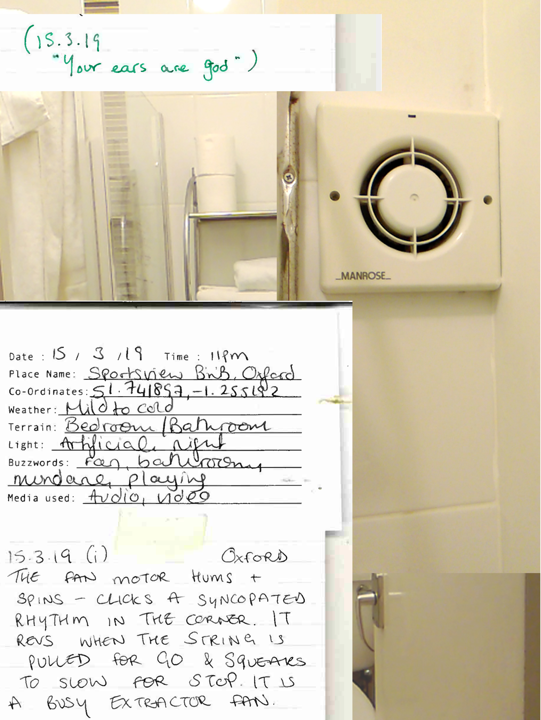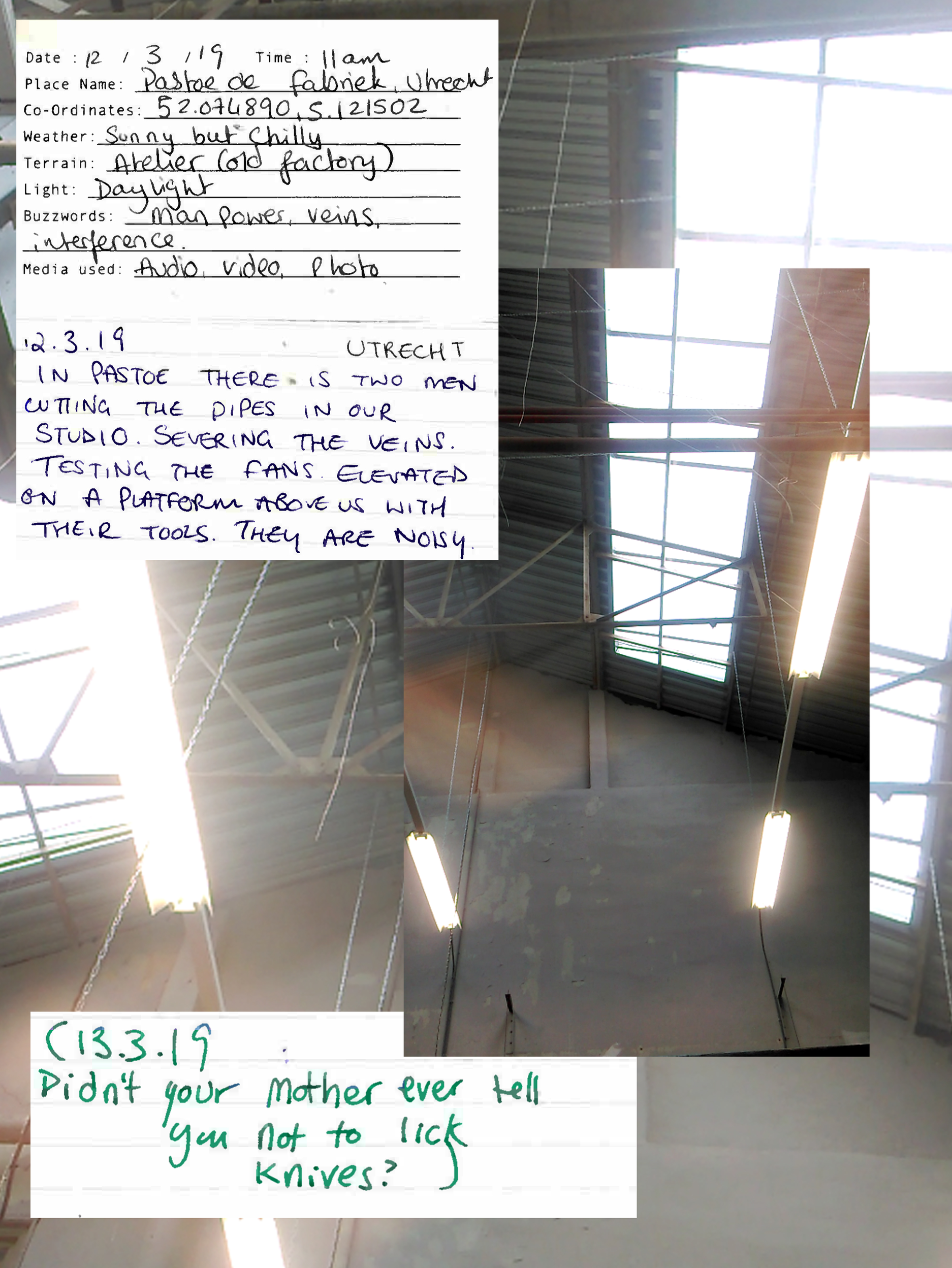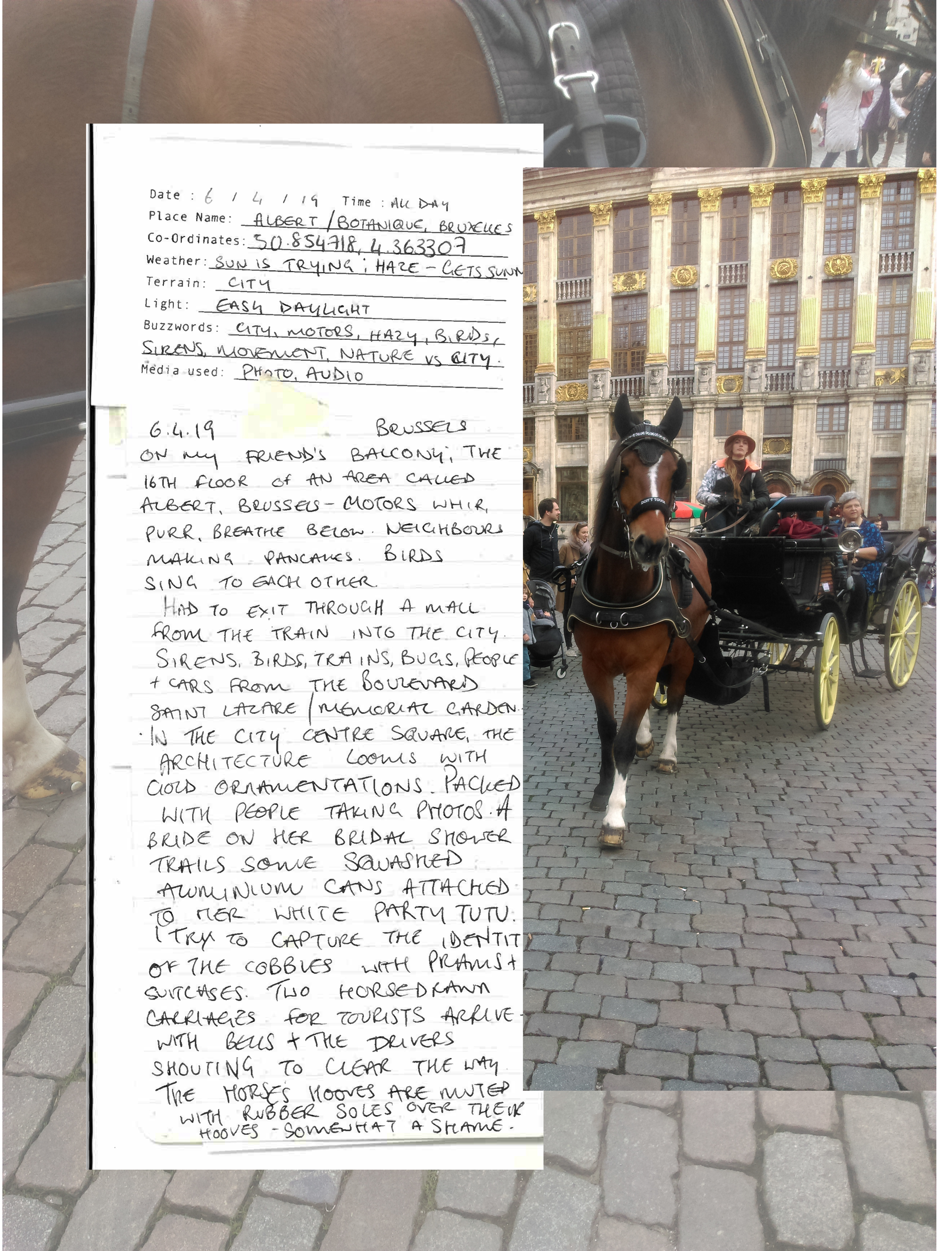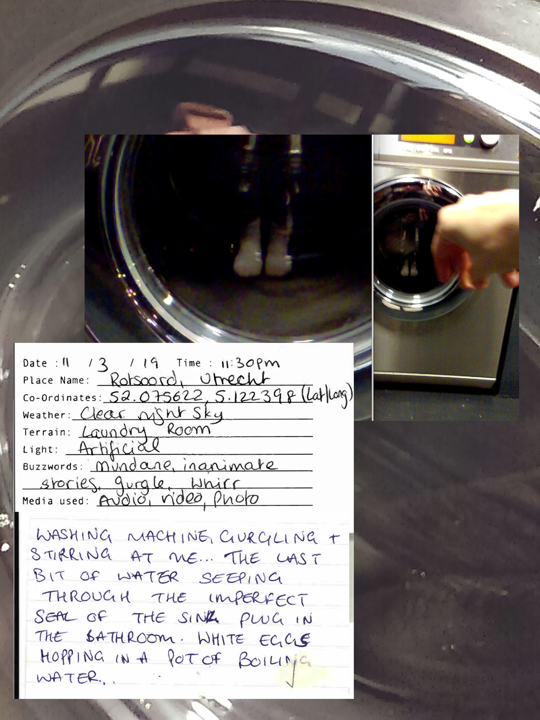 By the mode of 'sampling', I am documenting moments that evoke certain feelings in a space or situation: as though to extract the feeling from a space and time. The sampling forms these Audio Journals - recorded audio clips, with accompanying written log and photo or video. I am seeking something worth paying attention to in the periphery of typical experiences. It is to perhaps eventually form a particular style or aesthetic in my works, or work as Scenographic Foley to create works from, like a painter would have different colours of paint. It is to affiliate with the raw-ness of my surroundings to find something to play with. As written by Dewey: