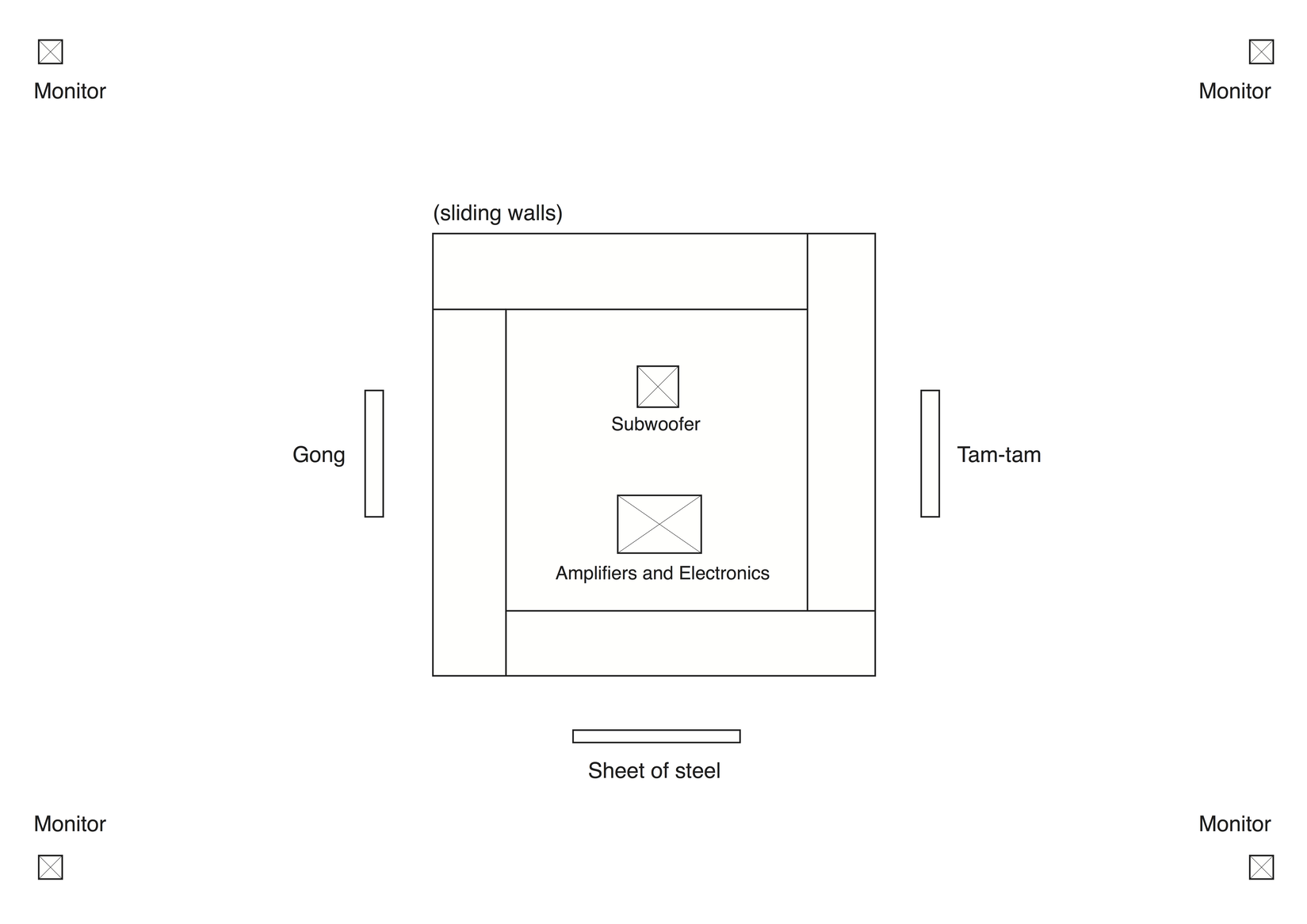 In the installation of the piece at the 1st ESSA conference, these soundscapes were played over 4 channels of audio, a subwoofer and three metal objects as resonant bodies through which the material was amplified via transducers: a tam-tam, an orchestral gong (in lieu of gamelan instruments, which we couldn't obtain) and a sheet of steel. These were distributed in a space around a central cubic area, parsing the room in such a way that visitors would have to move around in order to get a complete sonic impression of the piece (see Figure 2). The choice to use tam-tam and orchestral gong, although not originally intended, turned out to be fortuitous; since they are thinner and possess higher frequencies, they conducted the sounds of the various materials better than the large Javanese instruments, while they also contrasted nicely against the deep frequencies of the pervasive gamelan gongs. Filtering the sound through tam-tam, gong and metal sheet is meant to metaphorically show how music and sound can only be the conduit of one another through social relationships. Exciting the sound of the material substance of the artwork in the room further worked to evoke the physical reality of gamelan and steel production. This amplification through various metals elicited the materiality of the steelfactory and playing on acoustic instruments in a more visceral way than simple amplification would have done.