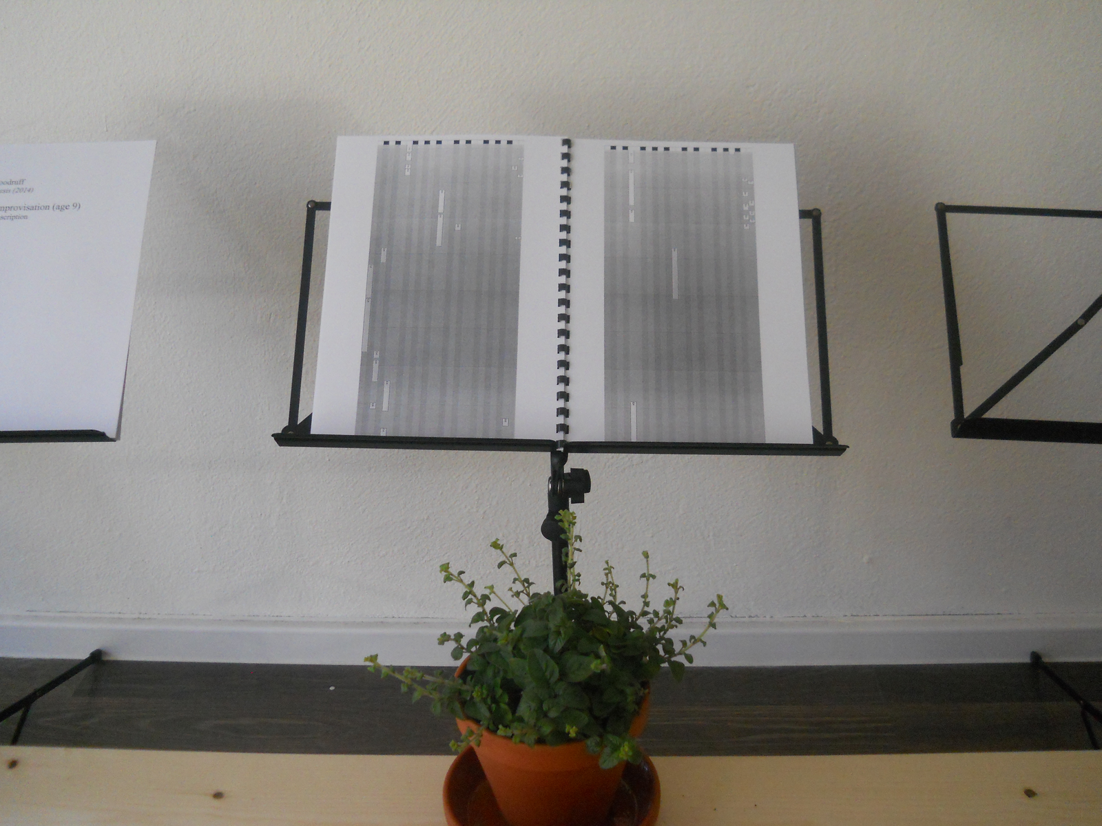 I used the principle "Observe and Interact" as the inspiration for a follow-up piece to Gongburgh, called Phonosynthesis, developed for a group show during the preview of the Berlin transmediale 2014 at the Errant Bodies project space. [8] By observing the sonic skills and habits of a group and how they are connected, it should be possibleto create possibilities for interaction, based on the observations, with music and sound. Local communities have detailed knowledge of history and geography, which are important to understand the ecology of how communities react to sound. Holmgren's call, as part of "observation and interaction," to "interact with care, creativity and efficiency" (Holmgren 2002: 14), are in harmony with my wishes to create participatory artwork that enhances difference by exploring modes of listening. During the piano lessons of five children (ages five, nine, eleven, and two who were eight years old), I played them a recorded soundscape of the site at the Botanische Garten in Dahlem. At this site the Technisches Universität project, "Permakultur & Terra Preta," has been granted a space to plant a permaculture garden. The children were then asked to improvise fitting music for the soundscape that they just heard, and their improvisations were recorded. In Phonosynthesis I encourage the gallery visitor to play transcriptions provided of the children's pieces on a toy piano for the five plants to "hear." These five herbal plants will be planted in the new permaculture garden, which is planned on the site where the original soundscape was recorded. Both the children's improvisations and the gallery visitor's interpretations of them will be mixed and arranged together with the recording of the original soundscape of the site in Dahlem that inspired this journey from garden, to child, to adult participant and back to garden again. This recording will be offered as a download on various websites in return for donations to the Permakultur & Terra Preta project.