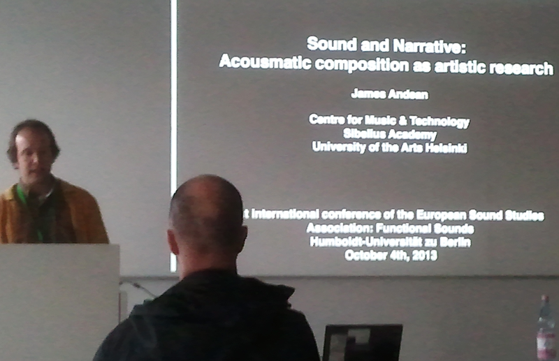 As another example of artistic research, James Andean from the Sibelius Academy in Helsinki explores, with his paper Sound and Narrative, the functional aspects of an acousmatic composition. What narrative cues and guidelines does (or even must) an acousmatic composition provide, sometimes unwillingly so? “The encounter of work and independent listener is […] often an extremely informative moment with regards to the nature of the work, and without this perspective, any consideration of the narrative aspects of a work are severely limited by the composers narrowed field of focus […]. This can be quite an alarming moment, as the composer witnesses the transformation of the work he intended into a potentially very different artwork.”