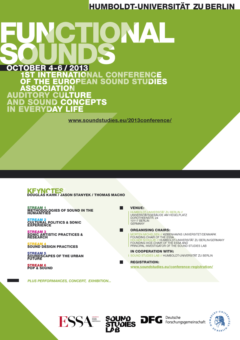 In October 2013 the Sound Studies Lab hosted and organized the first international conference of ESSA at the Humboldt-University, entitled Functional Sounds: Auditory Culture and Sound Concepts in Everyday Life. The conference was co-funded by the German Research Foundation, the DFG. Keynote speakers were Jason Stanyek from the University of Oxford and Douglas Kahn from the University of New South Wales.