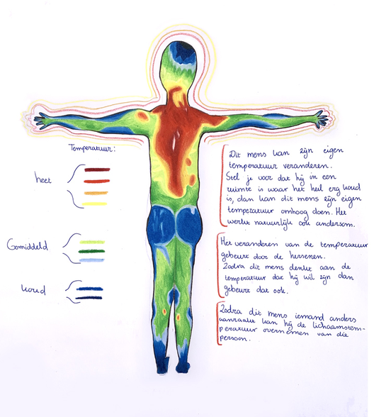 Stel je voor dat hij in een ruimte is waar het heel koud is, dan kan dit mens zijn eigen temperatuur omhoog doen. Het werkt natuurlijk ook andersom.