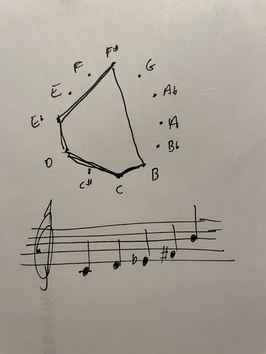 I combine this with a melodic and intervallic representation of the different lines and figures in the painting. I chose left hand intervals giving most possible harmonic color, and a lot of dimished chords, which have a lot of potential energy but not only one defined direction.