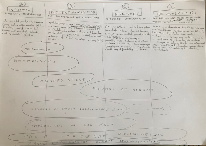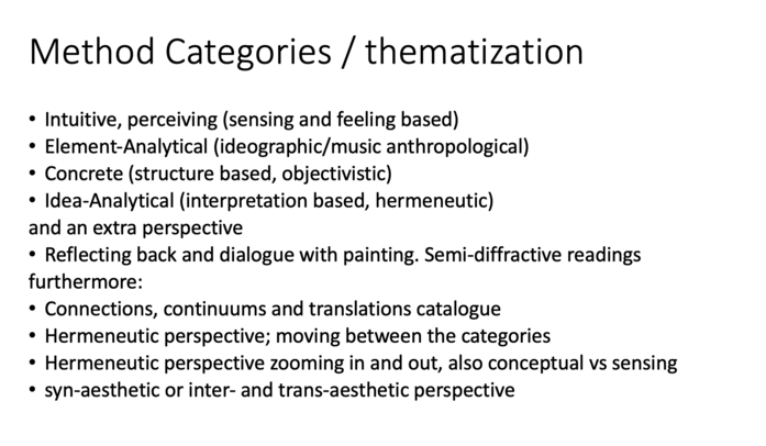 This mainly falls in categories 2 and 4 – Element analytical and Idea analytical. This is an example of experiments starting with analysis, reflecting, and concepts as a fundament for composition and improvisation, here based in the Element-Analytical category.