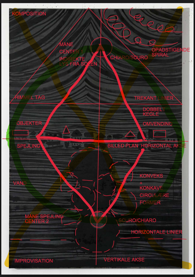 6) Starts at minute 10.36 using category 4 – Idea analytical except for improvisation/sketch: I mirror the existential negative-space that Tal R creates with his black-on-black painting of the moon that is reflected in Sortedam to a similar negative-space room with a classical black grand piano in a concert hall and a free improvisation, where the sound of the grand piano is mirrored through an analog electronically changing pulsating semi-compositional setup that provides both a tonal, varying, more and less random reflection and change of the musical input, and also a change of the sonic material that as a result sounds both like a grand piano in a way, but also not a grand piano, similar to the moon at the same time being and not being a moon.