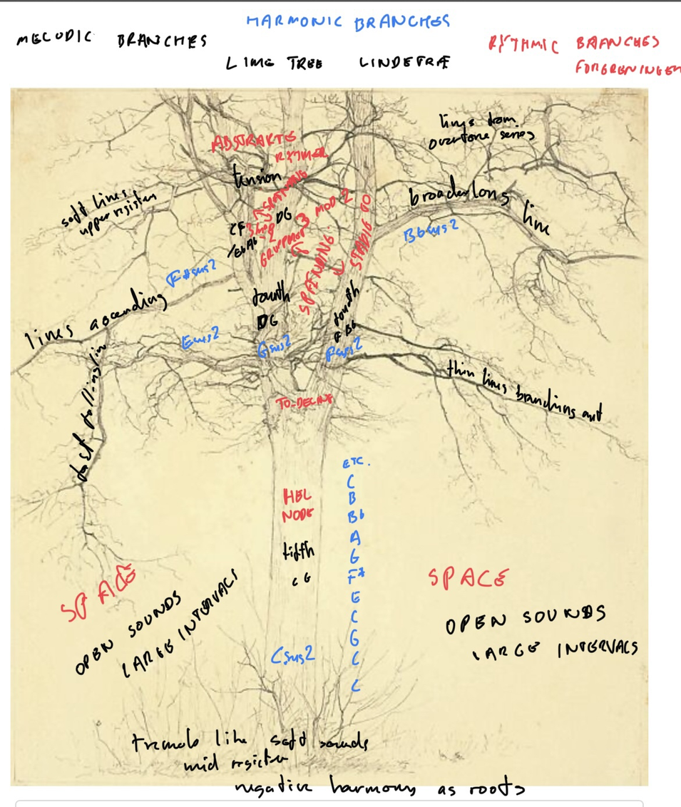 The final concert version, which can be heard in the video clip from the concert Live at The Getty Museum for Limewood Tree, is the natural overtone row representing the tree and a mirroring of these notes as the roots. The second part of the music piece is based on the sense that the depicted tree seems to possess and express a personality and a mood, which the music interprets. This connects to my experience of all the artworks of various non-human objects in an exhibition I saw, turning into portraits or people and mirrors. This is described further in P4 Reflections.