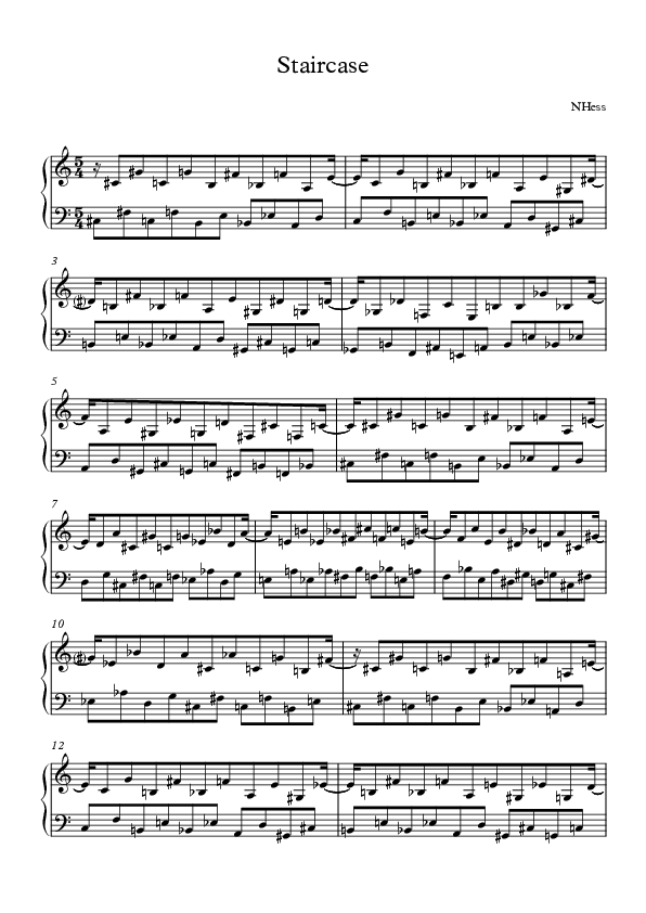 1. I created a chromatically descending five-note pattern representing the five echoes of the woman in the picture, and with regards to Ligeti's “L'escalier du Diable,” which could have been a transformative reflection of M.C. Escher’s lithograph print "Relativity" depicting never-ending staircases. I experimented with echoing effects, placing four echo versions of the full track, displaced with approximately 32nd of the note value. This to represent the four echoes in the painting.