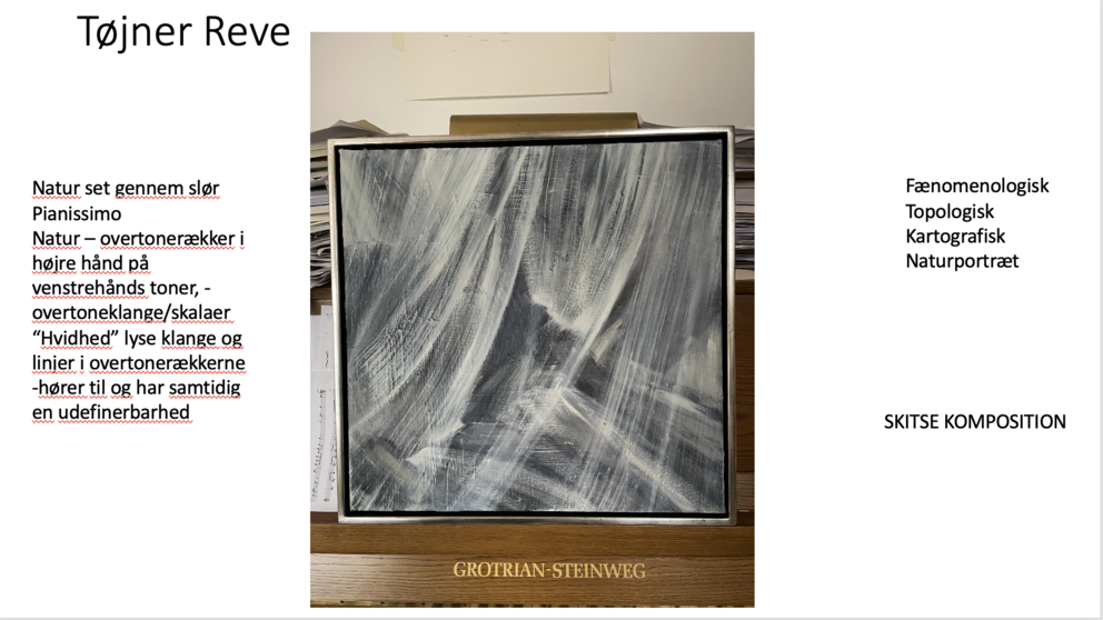 Deep sounds and the black keys on the piano represent the black in black in the painting, and the contextualisation to 18. century Danish painting is weaved into the improvisation and surrounding pieces in the concert.