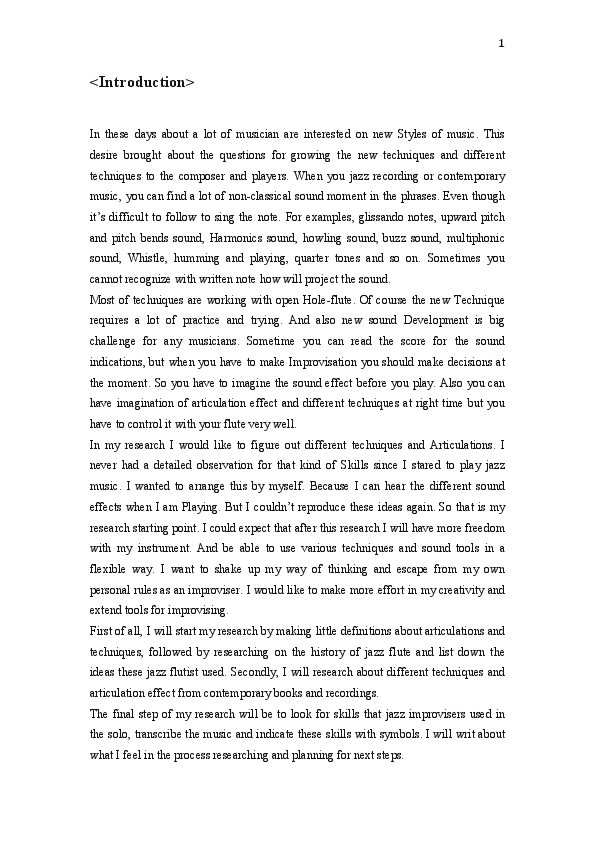 Name: Yoojin Ko Main Subject: Jazz Flute Research Coach: Jarmo Hoogendijk Title of Research: Different Techniques and Articulations effect for the flute improviser Research Question: How to discover different techniques and articulations for improvising on the flute Research Process: I figured out different techniques and Articulations. I made detailed observation for these kinds of skills and arranged this by myself. This process began because I can hear the different sound effects when I am playing, but I could not reproduce these ideas each time. I expect that after this research I will have more freedom with my instrument and be able to use various techniques and sound tools in a flexible way. I want to shake up my way of thinking and escape from my own personal rules as an improviser. I started my research by making little definitions about articulations and techniques, followed by researching on the history of jazz flute and listing the ideas these jazz flute players used. I researched about different techniques and articulation effects from contemporary books and recordings. The final step of my research was to look for skills that jazz improvisers used in their solos, to transcribe the music and indicate these skills with symbols. Summary of Results: I came to realize that I did not know the full details of all the different techniques and articulations needed for improvising. Each musician has their own unique way of improvising and their musical abilities and their environment influence their development of their techniques and articulations. To be able to improve in good musical context, I had to master his/her techniques and articulations. Also I have to be aware of when I am using the different techniques such as the alternative fingerings and tone-color trills during my performance. I have to achieve clean and fine techniques to be able to play the different ideas that comes to mind with a flexible techniques and articulations. I would like to try to compose songs with different techniques and articulations. I want to put special techniques and different articulations in these tunes so that I also can learn from it and increase my individual colorations. Eventually when I improvise, I want to be able to express all of my emotions with good musical control. All through my research I dreamed that I want to be flexible and free with my flute playing in the near future and I am certain that I can achieve it with this research.