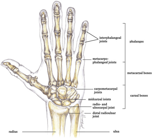 Moving down the hand the five metacarpals make-up the palm and the phalanges make-up the fingers. Each digit has three phalanges except the first one (the thumb) which has two. Anatomically the fingers are numbered from 1-5 from thumb to pinky.