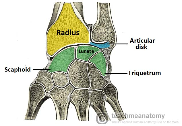 The wrist is a very complicated joint. It originates at the end of the radius and ulna where the eight carpal bones meet. These eight bones make the wrist very mobile but also unstable. The carpal bones are the scaphoid, lunate, triquetrum, pisiform, trapezium, trapezoid, capitate, and the hamate. (Moore and Dalley, 2006, page 869-873)