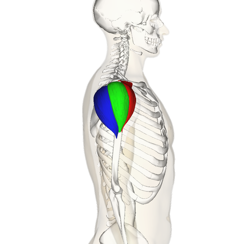 The anterior chest muscles are pectoralis major, pectoralis minor, subclavicus and serratus anterior. This group of muscles is mostly responsible for forward and upward motion of the shoulder blade as well as moving the humerus of the arm towards the body. The pectoralis muscles are the prime movers of the arm in front of the body and can generate the most force of the four. Subclavicus is a stabiliser for the clavicle and the serratus anterior is a stabiliser for the shoulder blade. The serratus anterior is quite important because it holds the shoulder blade against the ribcage which is very important for overall shoulder stability (Moore and Dalley, 2006, p. 752).