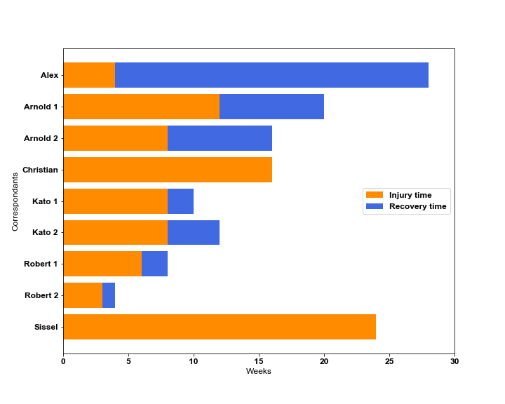 Looking at the length of the injuries (Table 1) for each correspondent, we can see that their injury times were very different. It should be noted that Sissel had to have surgery and has only recently been cleared to play and Christian is still working on his recovery. We can see that Kato and Robert have relatively shorter times of injury and recovery than others. There does not have to be a specific reason for this other than their injuries were not as severe they had clear tendon injuries. Even though Christian’s and Alex’ time away from their instruments was not very long, their recovery is slow which can hint that the injury was nerve related. As Katarina Porander (2020) puts it, “nerve injuries are always much slower to recover and need a longer recovery process”.