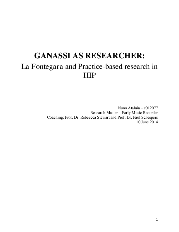 Name: Nuno Galego Marques Atalaia Rodrigues Main Subject: Recorder Research Coaches: Paul Scheepers and Rebecca Stewart Title of Research: Ganassi as researcher, Practice based research and new horizons for HIP Research Question: What changes when I start reading treatises of the past as the result of a practice based research not unlike my own? Research process: The following questions have guided my research and relationship with the XVII century recorder treatise La Fontegara: Was Ganassi an artistic researcher? Can his 1535 treatise, La Fontegara, be thought of as the result of sixteenth century practice based research? What will change in our relationship to documents of the past once we look at them as analogous to our own artistic concerns? What could this understanding of artistic research as a trans-historic event mean for Early Music in particular? My research and thesis leads me to a close reading of Ganassi’s recorder and diminution treatise La Fontegara, trying to go beyond the text and its possible literal meanings and tracing the lost instrumental practice of diminution. With this first treatise of its kind, Ganassi inaugurates an age of instrumental literacy, which has irrevocably shaped our perception of musical practice. By linking the document to its biographical, social, theoretical and practical roots I try to sketch out the possible influences and projects (both political and artistic), which took part in making this work possible, helping to understand the trans-historic significance of research in defining a place for the artist within broader society. Also, I take the chance to reflect how this critical intimacy I establish with the work changes the very core of my identity as a recorder player by shaping my practice as a dialogue with a distant and mostly silent past. Summary of Results: The goal of this research is to stress the importance of research in the arts in redefining the role of the musician within society and of opening up a new wave of debate with which to vitalize the historically informed performance movement. Ganassi’s La Fontegara is a document that holds a far greater importance than that of a simple recorder tutor, which positioned it as the first document in the project of emancipation of instrumentalists and their music. Furthermore, the document should be seen as a vital part of the XVII century propaganda project of diffusing the myth of Venice through its use of speculative music tropes such as the theory of proportions. FInally, I wish to rethink our present relationship to these documents as performers. They were not musical cookbooks but rather crystallizations of a continuous struggle between the performer’s knowledge and his need to describe it. To read La Fontegara, is to go beyond the treatise and speculate on the oral practice from which it stems.
