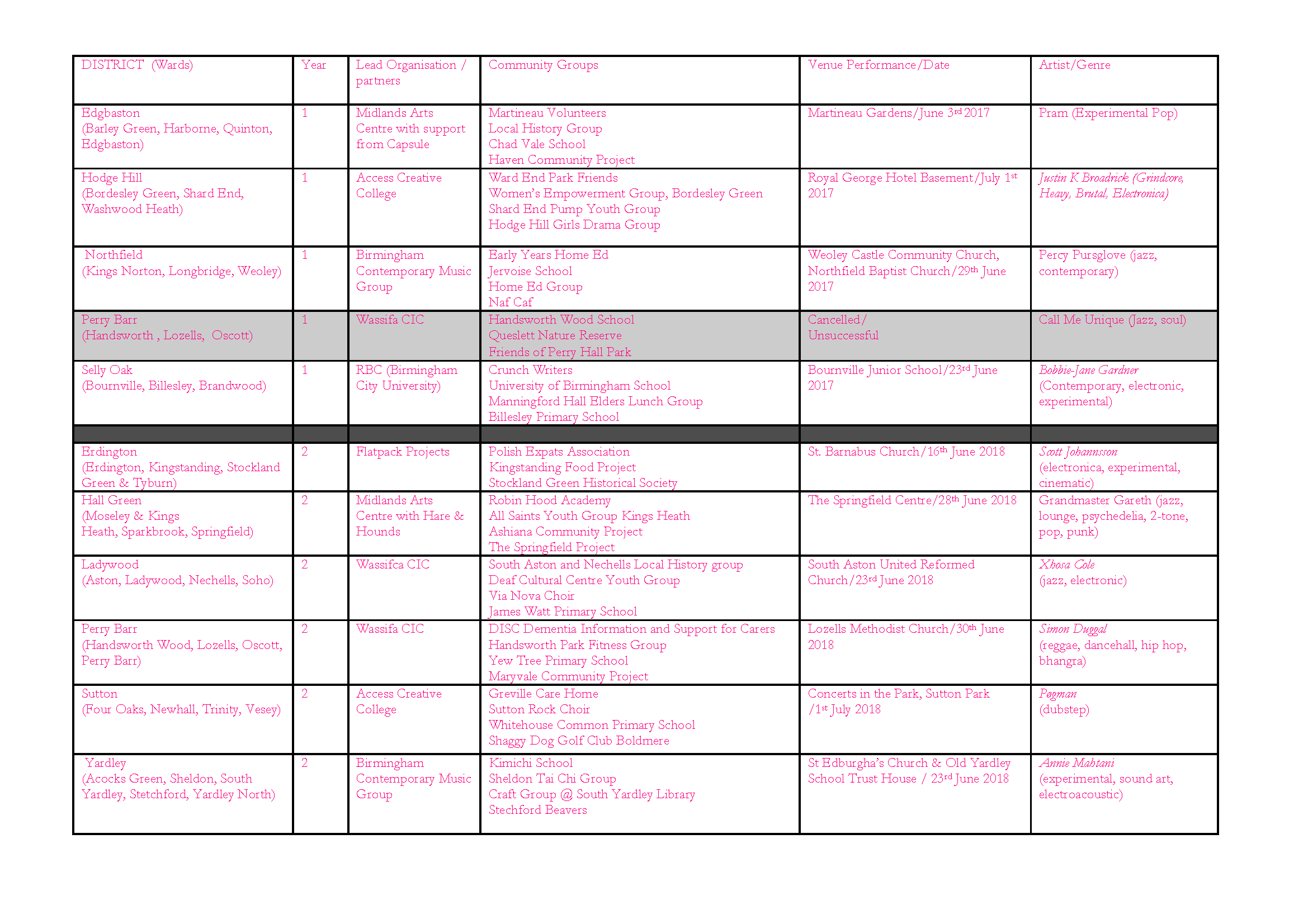 While recruiting arts organisations to work as artistic partners, I gained insight into the current financial and capacity struggles that arts organisations were facing (Harvey, 2016). It appeared very unlikely that I would be able to raise enough funding to support forty composer commissions to work in one ward each. This is the reason why for-Wards resulted in being ten commissions as it seemed more achievable and deliverable than forty separate ones. For the compositional work to take place in a hyperlocal environment, all the artistic and creative partnerships needed to be from Birmingham. However, it was not possible to recruit an artistic partner from each of the ten districts because most arts organisations are situated in the centre of Birmingham. Instead, each artistic partner selected the district in which they wished to work and thus further supported community access to arts and music making across the city.