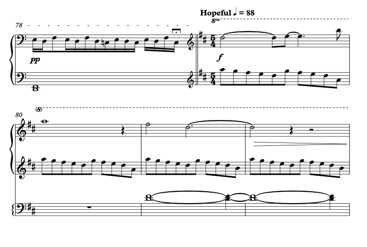 The motif from the A section returns to a D Major-sounding tonality at bar 79. This signals a more hopeful third and final section. This section was a musical response to one of the collaborators carrying out further historical research where they reported the Cadbury family role in the abolition of slavery. The structure and idea for Bournville Chimes were devised collectively. These ideas came about through our discussions in the composing workshops. We did not need to vote for one idea over another, our conversations naturally led to our piece manifesting in this way.
