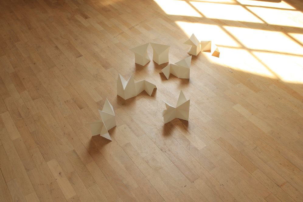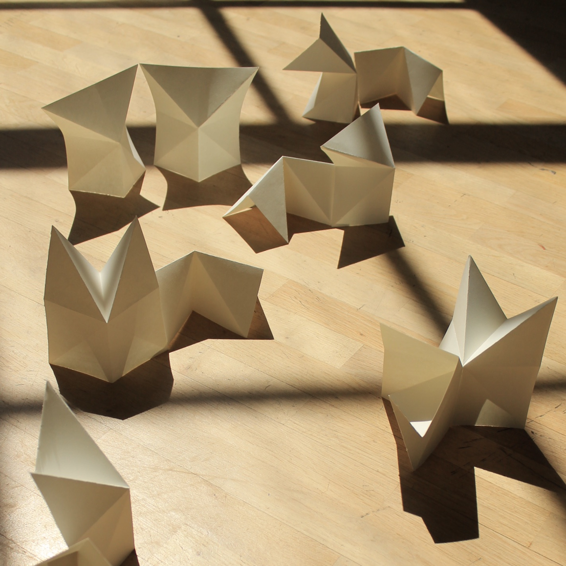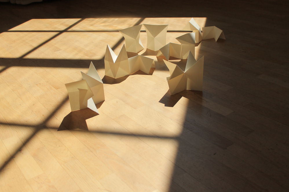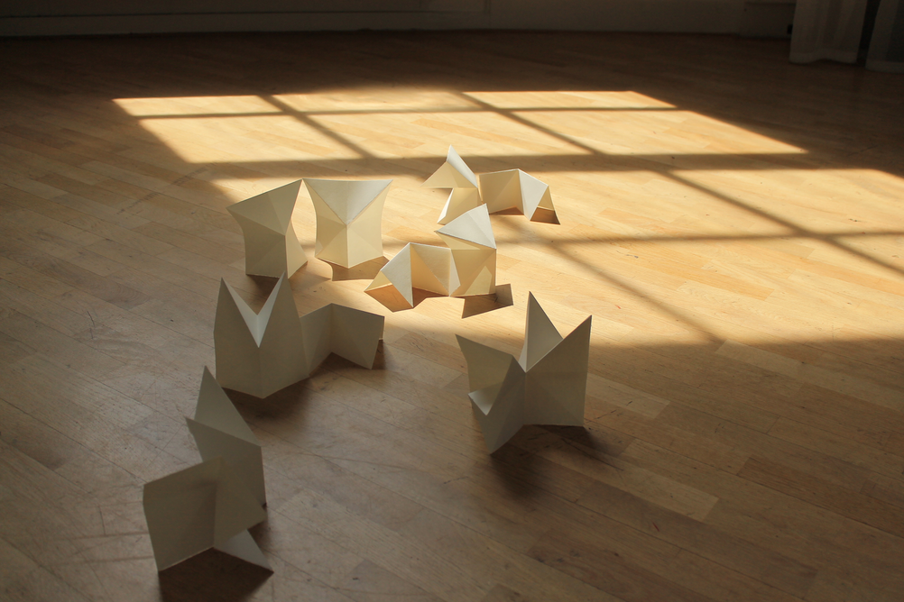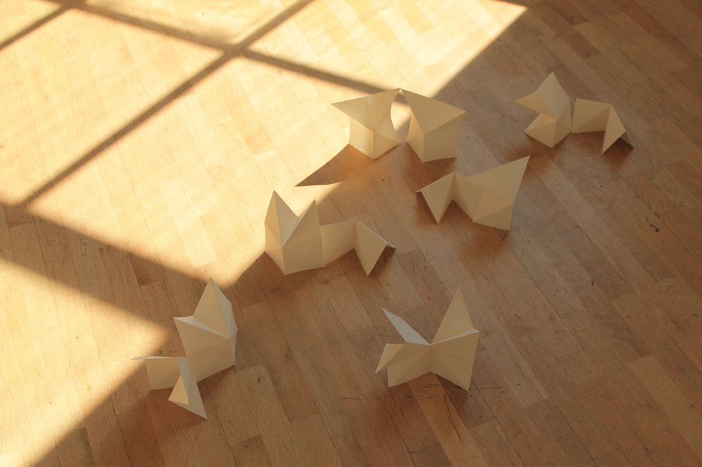 For example; using the passage of time, and natural light, to alter the materiality of paper. I was inspired by a Portland architecture project OrigamiPDX who have a beautiful video of light moving over some paper shapes. There's however is artificial so I wanted to test it with natural light and real-time. After all, their video is a simulation of what they expect to happen naturally.