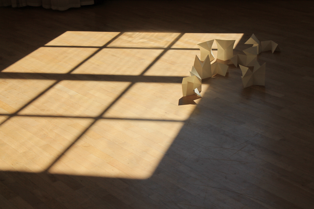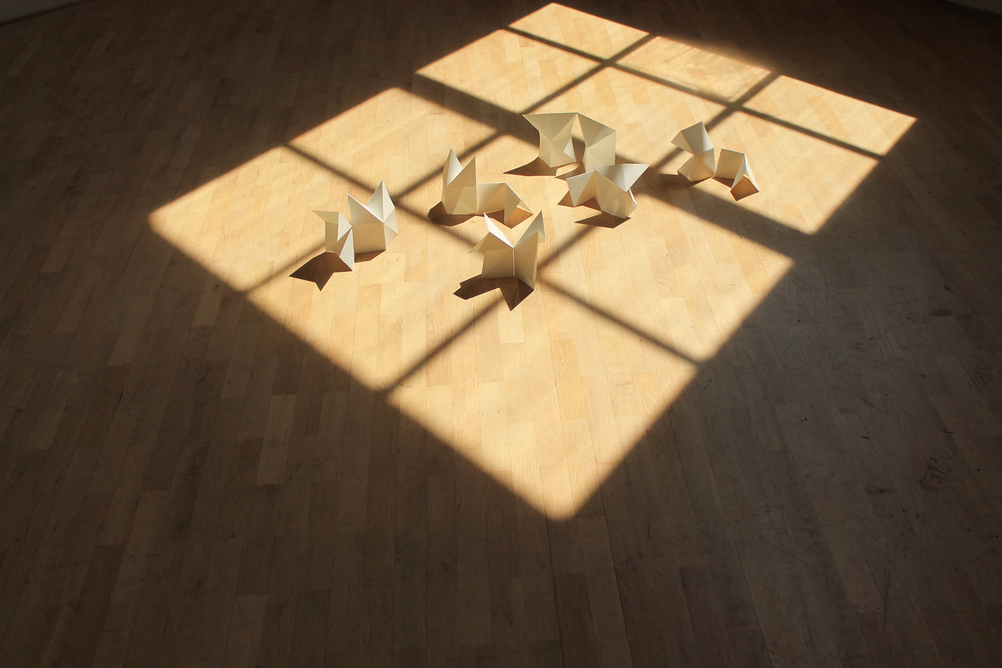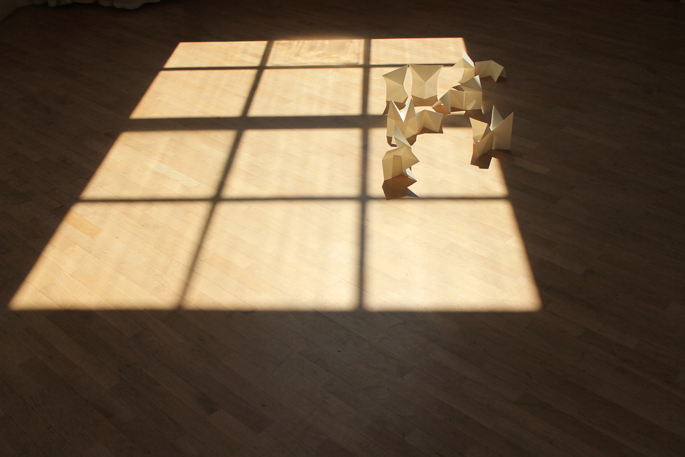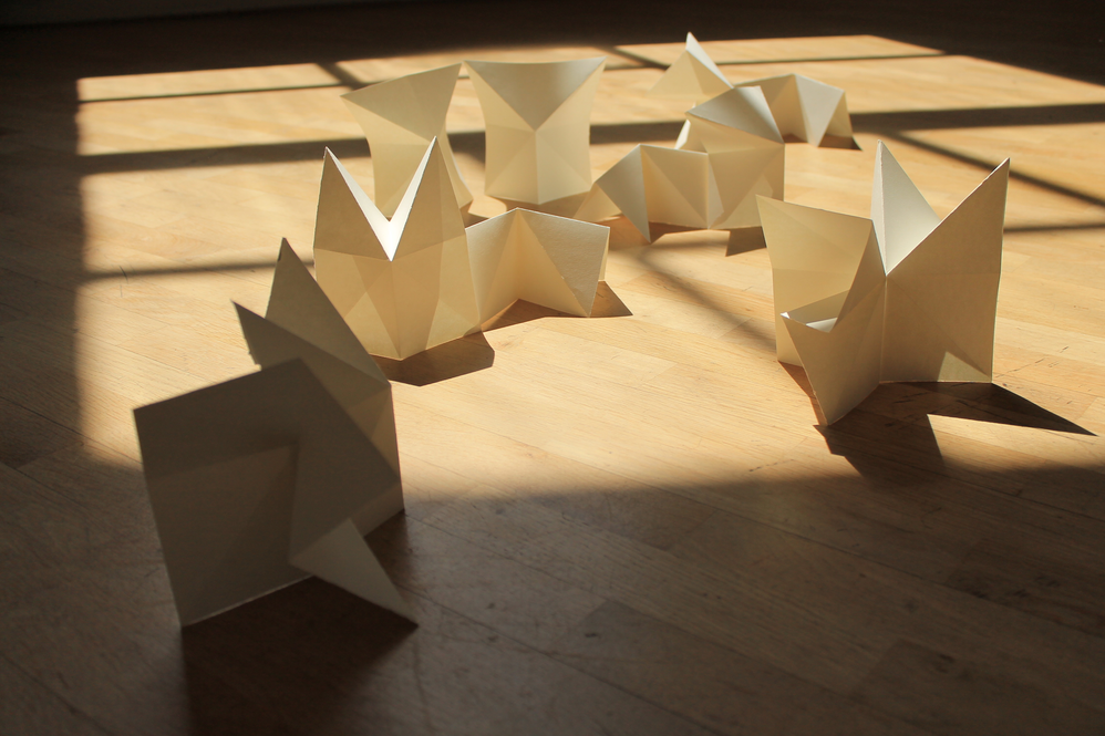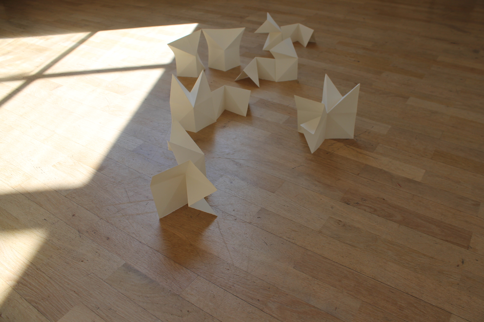 For example; using the passage of time, and natural light, to alter the materiality of paper. I was inspired by a Portland architecture project OrigamiPDX who have a beautiful video of light moving over some paper shapes. There's however is artificial so I wanted to test it with natural light and real-time. After all, their video is a simulation of what they expect to happen naturally.