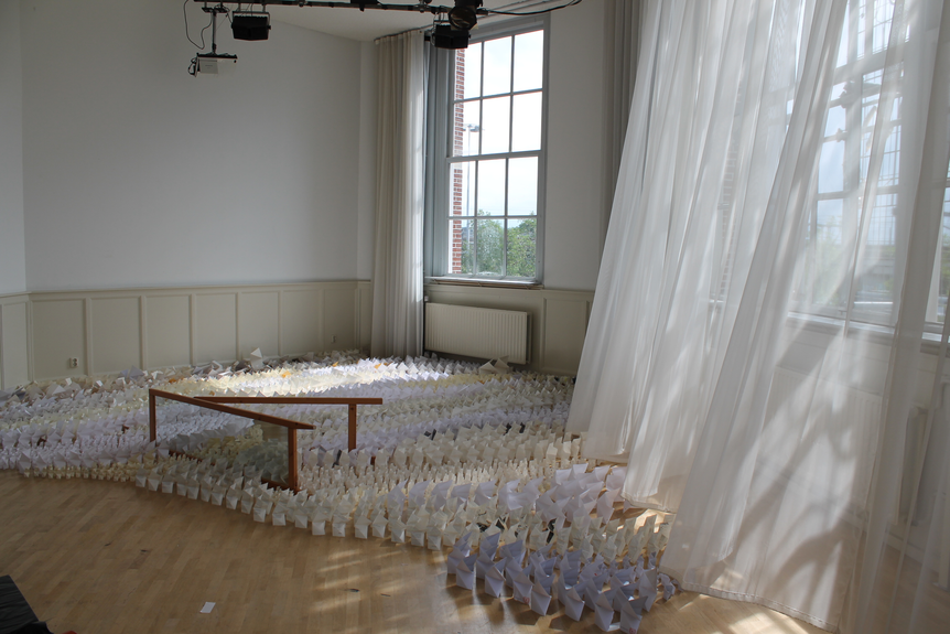 - Atmosphere: The billowing curtain was an initial source of inspiration and documentation in the room. I wanted even with the new trajectory to incorporate it somehow. Through experimentation, I eliminated its presence as a source of sound or wind. The sound is too rustled when brushed again the papers and the wind holding the potential for a catastrophe for the small, standing papers. In the end, I tied the curtain down making it appear as if the wind was blowing in even with the window shut. Conceptually this is to increase the atmosphere that the room is frozen in time. Firstly for the metaphor, when you stop putting in the work nothing moves forward or changes... Secondly, because the entire work and experience is time-based, so once I have left the room the project itself stops. Nothing accumulates and nothing grows. After a conversation with a tutor, I realised that conceptually the project could be repeated but since my work is so based on time and experience mos likely the material with change with each iteration.