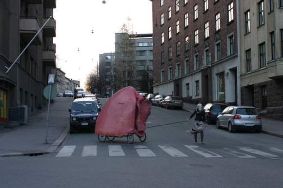 Interactive, mobile performance sculpture. On display in May 2007 in Helsinki City Art Museum (Tennispalatsi). The artist took her sculpture for a walk from the museum every two days. She invited people walking by to enter the sculpture, which was roomy enough to hold an adult lying down.