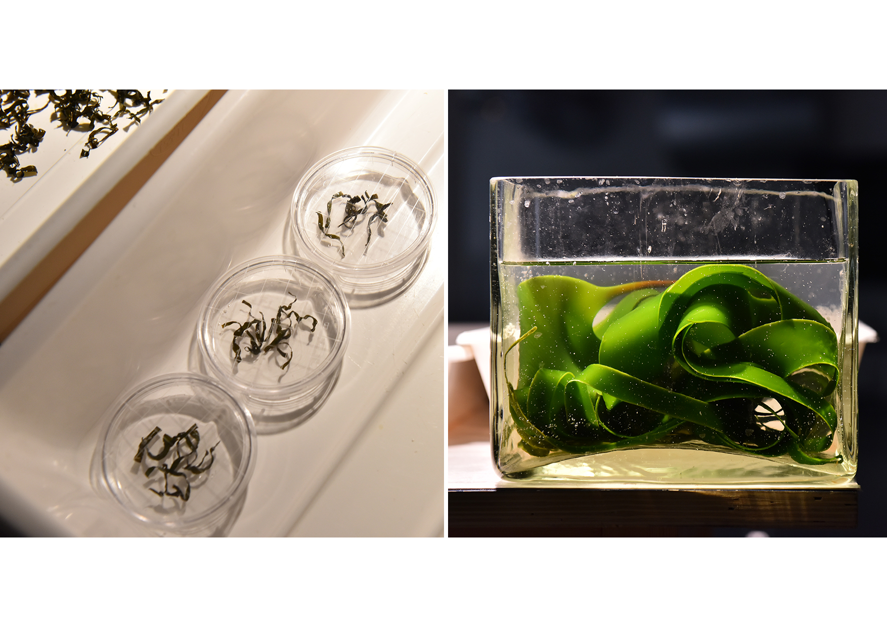 Visningsrommet USF is transformed into a relay station or platform in an ongoing negotiation of forests beneath the surface of the sea. It originates from the project Agential Matter (Invisible Landscapes), coming now to an end as artistic research fellowship at The Art Academy at KMD (Faculty of Fine Art, Music and Design, University of Bergen). The work arises from journeys along the coast to pay visits to diverse places, where interests regarding undetermined futures nurture the observation of algae. It is based on the entanglement of personal and socio-political concerns.