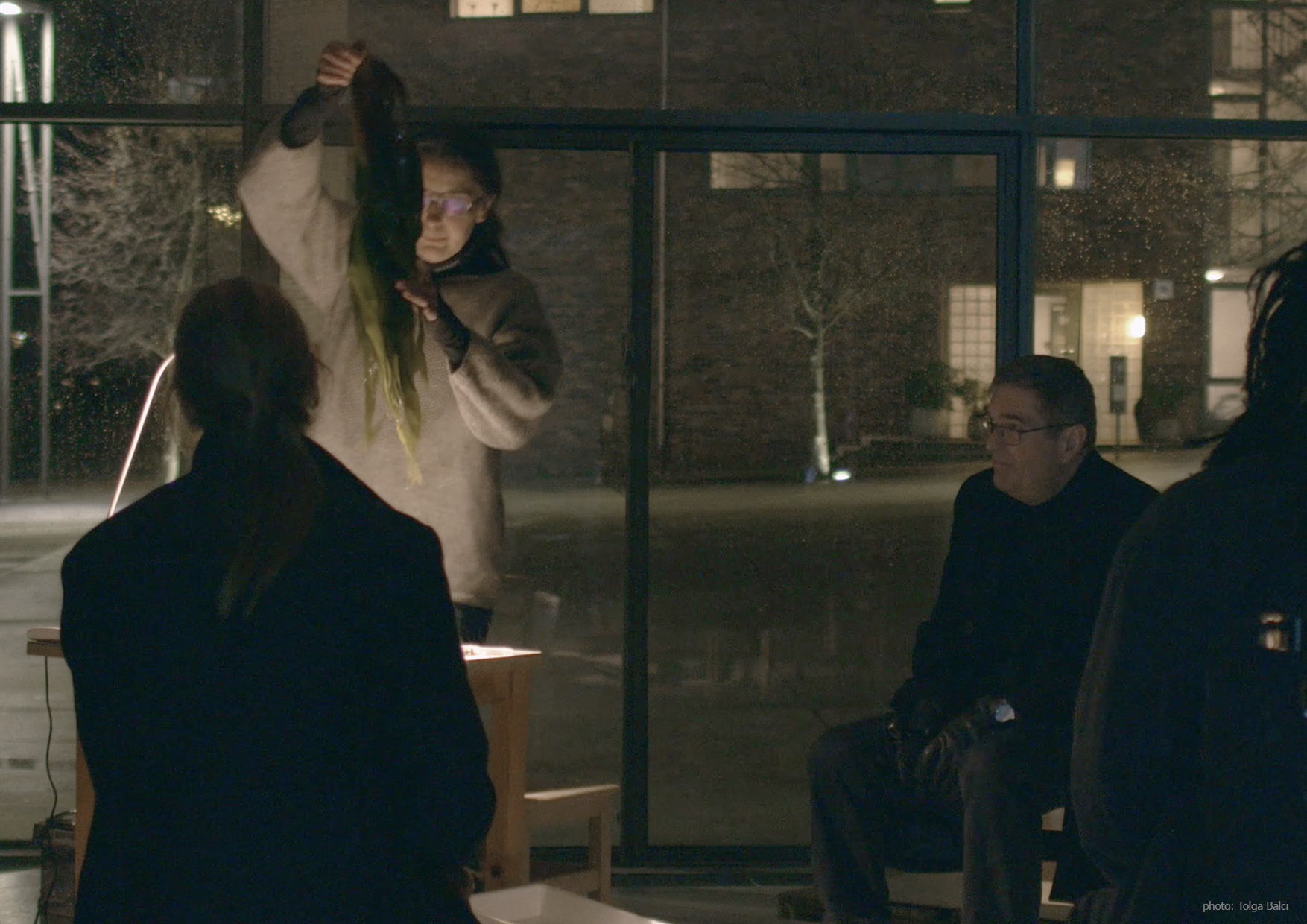 At the time when science began to seriously define its own sphere in the 18th-century, it was of great importance to show experiments for a small exclusive public to witness what happened. Truth was to be demonstrated. In a similar manner the audience is invited to witness processes gathered around a small table. At the same time speech reflects on doings carried out to approach an understanding of the world. The space becomes an echo chamber, where doings and sayings in video footage from the wet lab on a research vessel are repeated and responded to.