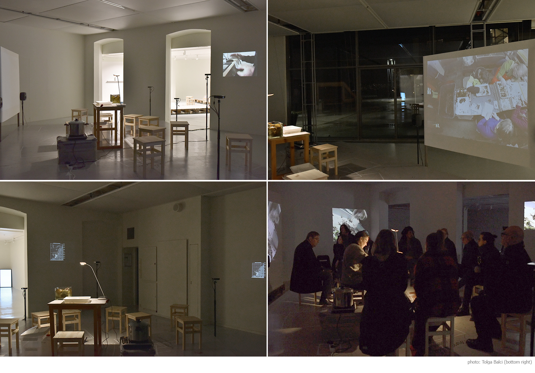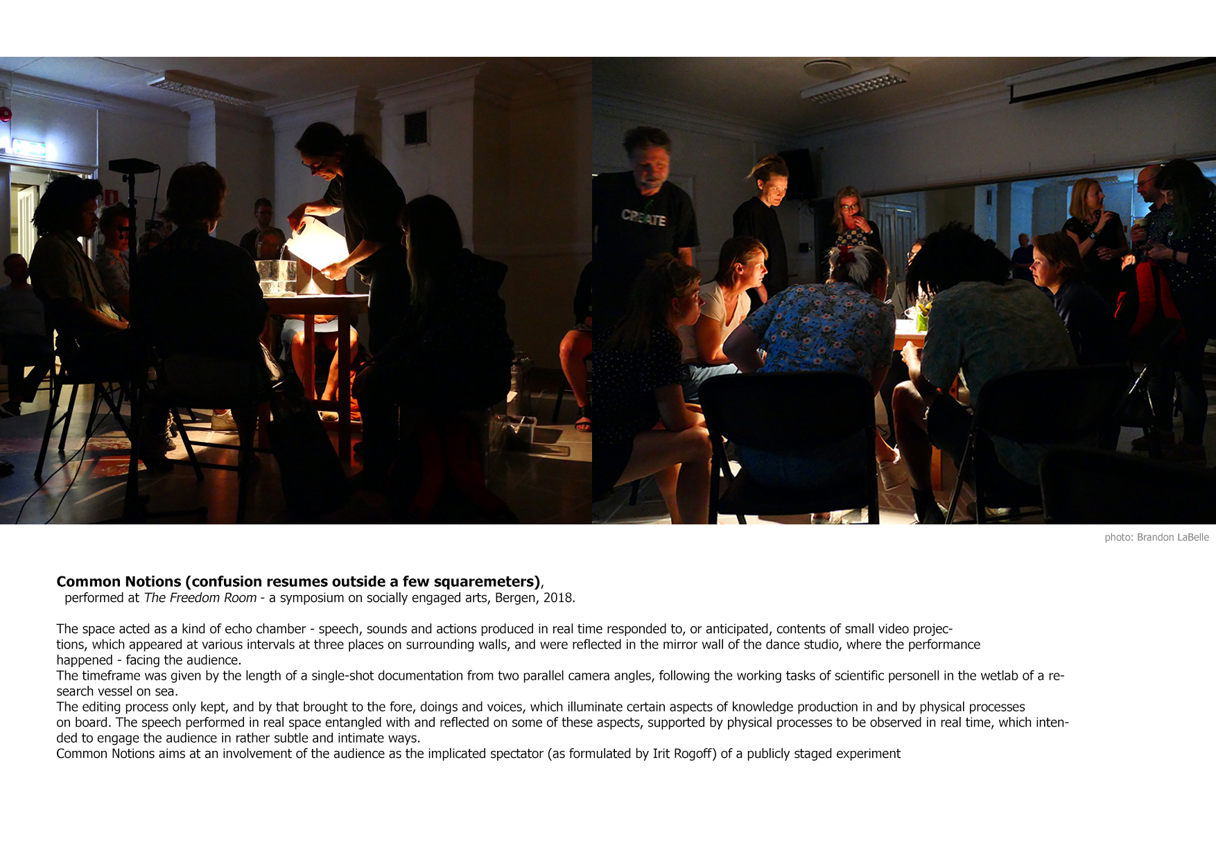 At the time when science began to seriously define its own sphere in the 18th-century, it was of great importance to show experiments for a small exclusive public to witness what happened. Truth was to be demonstrated. In a similar manner the audience is invited to witness processes gathered around a small table. At the same time speech reflects on doings carried out to approach an understanding of the world. The space becomes an echo chamber, where doings and sayings in video footage from the wet lab on a research vessel are repeated and responded to.