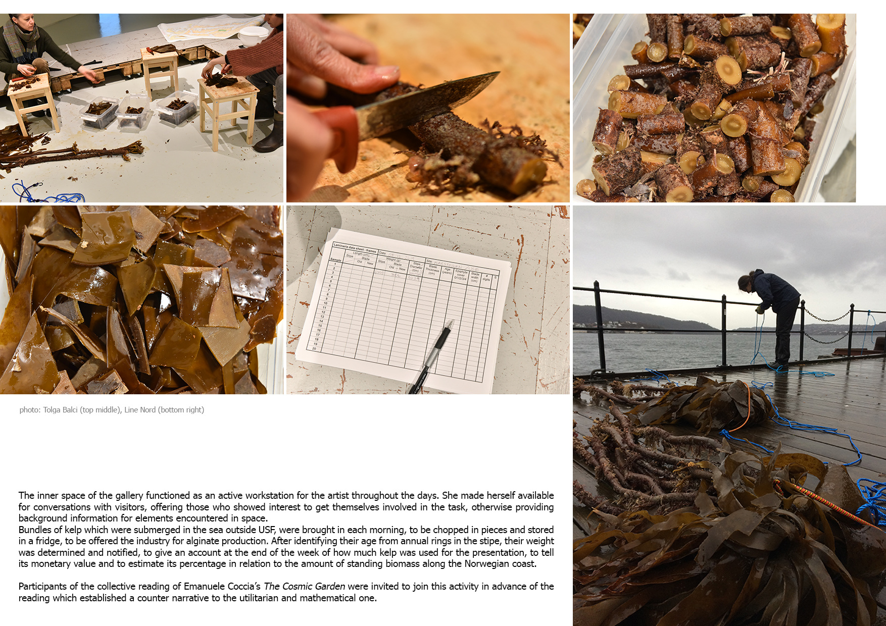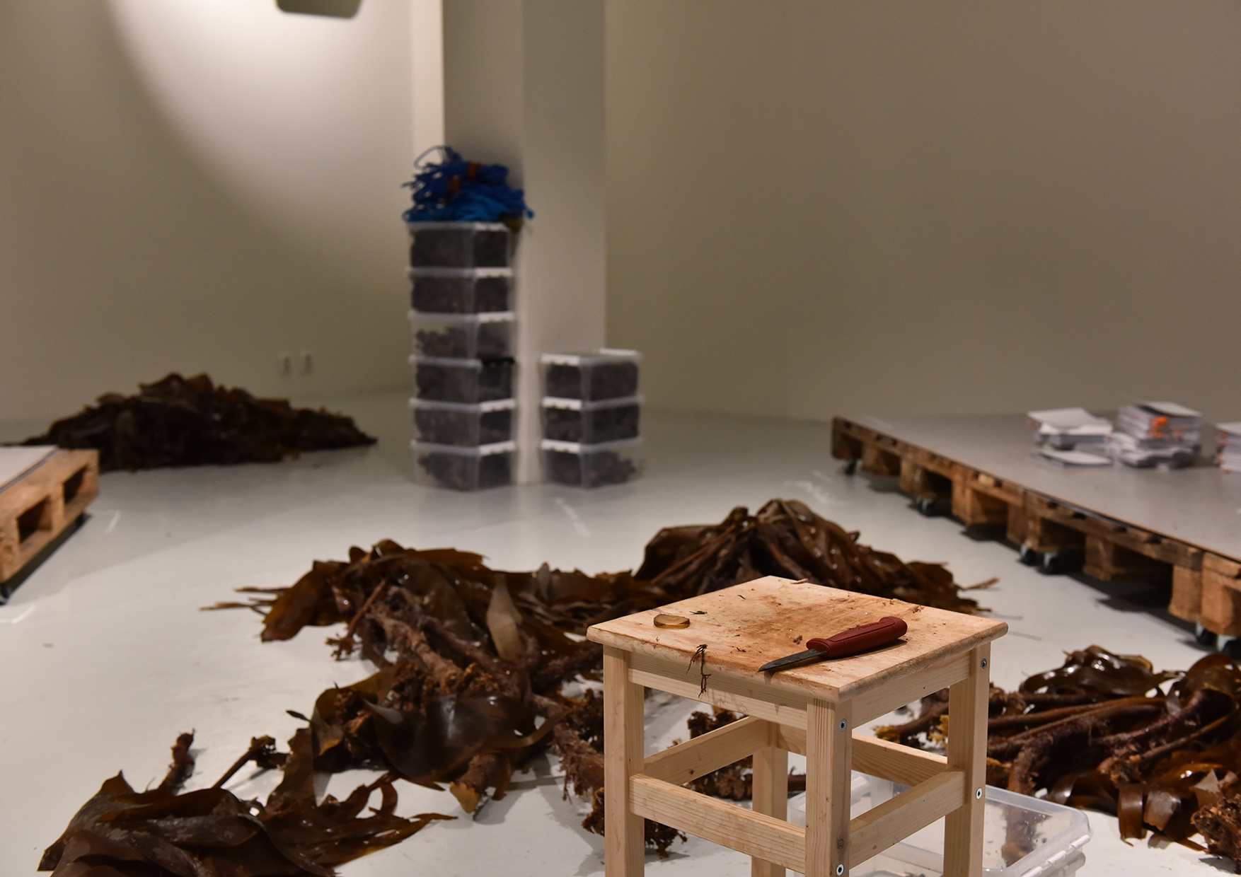Some kelp is harvested close to Marsteinen in the south of Sotra, with a boat from the Espeland marine biological station, and processed over the days in the gallery space. Arrival depends on weather conditions.